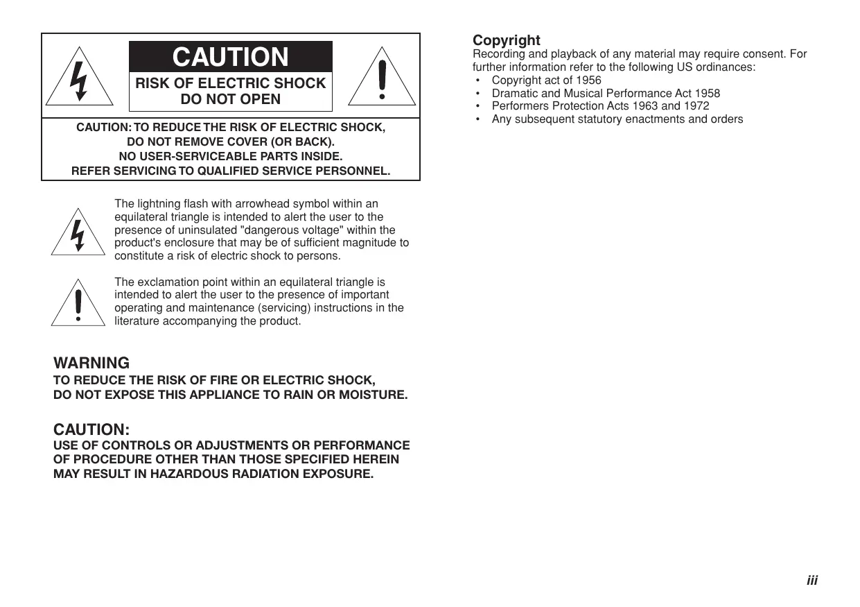 CAUTION: TO REDUCE THE RISK OF ELECTRIC SHOCK, DO NOT REMOVE COVER (OR BACK). NO USER-SERVICEABLE PARTS INSIDE. REFER SERVICING TO QUALIFIED SERVICE PERSONNEL. The lightning flash with arrowhead symbol within an equilateral triangle is intended to alert the user to the presence of uninsulated "dangerous voltage" within the products enclosure that may be of suficient magnitude to constitute a risk of electric shock to persons. The exclamation point within an equilateral triangle is intended to alert the user to the presence of important operating and maintenance (servicing) instructions in the literature accompanying the product. WARNING TO REDUCE THE RISK OF FIRE OR ELECTRIC SHOCK, DO NOT EXPOSE THIS APPLIANCE TO RAIN OR MOISTURE. CAUTION: USE OF CONTROLS OR ADJUSTMENTS OR PERFORMANCE OF PROCEDURE OTHER THAN THOSE SPECIFIED HEREIN MAY RESULT IN HAZARDOUS RADIATION EXPOSURE. Copyright Recording and playback of any material may require consent. For further information refer to the following US ordinances: Copyright act of 1956 Dramatic and Musical Performance Act 1958 Performers Protection Acts 1963 and 1972 Any subsequent statutory enactments and orders iii