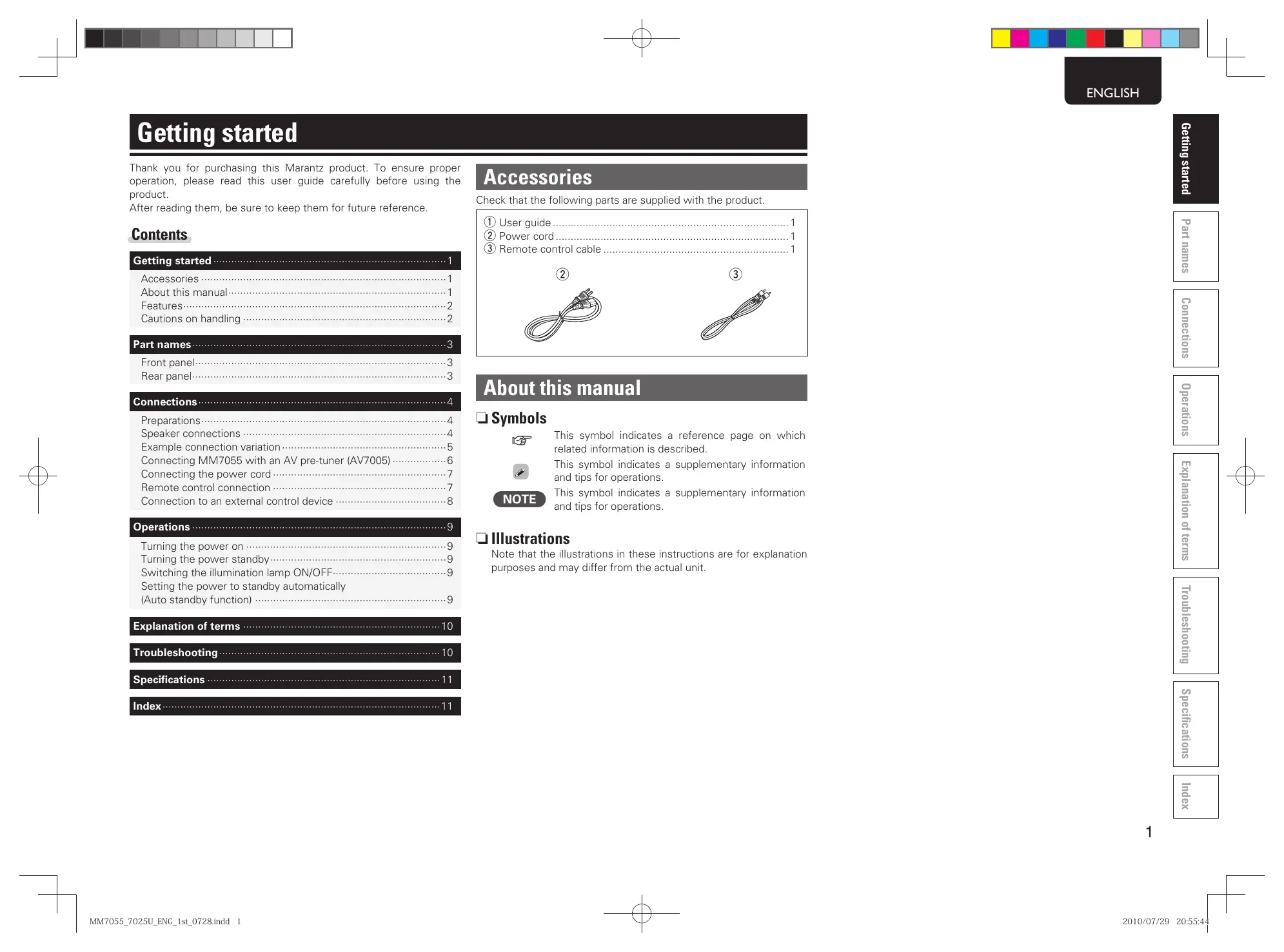 Preparations.…. Speaker connections ce Example connection variation. COM Connecting MM7055 with an AV pre-tuner (AV7005) - Connecting the power cord ; Donne Remote control connection rnneneneenennennnnn Connection to an external control device eneeneneneenennen es " CRRERESS Turning the power on = ___ -9 Turning the power standby -9 Switching the illumination lamp ON/OFF -9 Setting the power to standby automatically {Auto standby function) errrennencenenneennnennnnn À) U_ENG_1s0728indd 1 Accessories Check that the following parts are supplied with the product e) e) About this manual Q Symbols x This symbol indicates a reference page on which related information is described This symbol indicates a supplementary information and tips for operations. NT This symbol indicates a supplementary information and tips for operations.