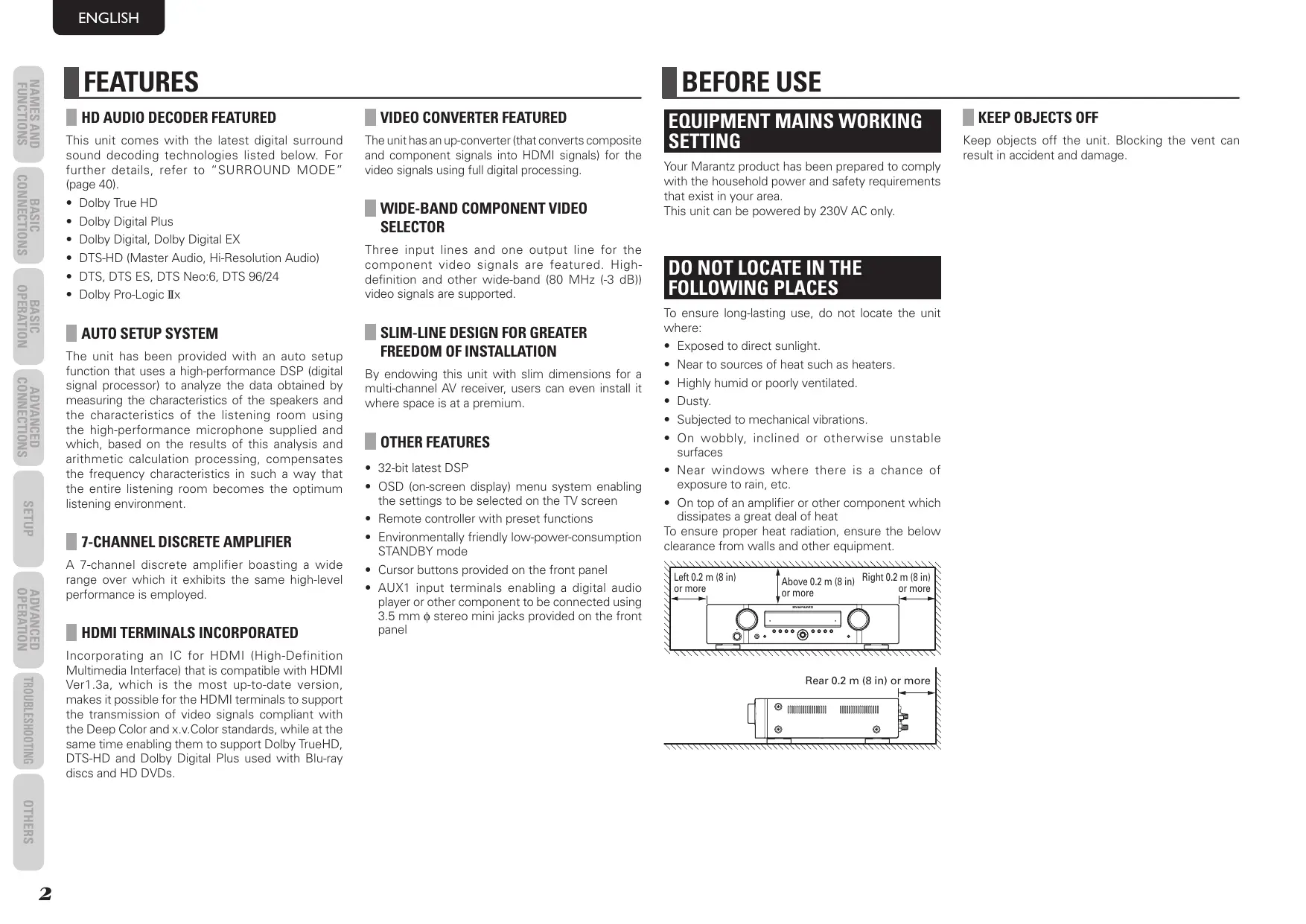 Frequency Range 531 KHz to 1602 kHz Signal to Noise Ratio Usable Sensitivity (Loop Antenna). .. 400 Hz, 30 % Mod. 0.7 % …+ 18 kHz 70 dB Distortion Selectivity.. AUDIO SECTION Power Output (20 Hz - 20 kHz/THD=0.08%) Front L&R (8 ohm load, Per channel) ..50 W Center (8 ohm load, Per channel) 50 W Surround L&R (8 ohm load, Per channel) Surround Back L&R (8 ohm load, Per channel)... Power Output Front L&R (6 ohm load, Per channel) . Center (6 ohm load, Per channel) …….60 W Surround L&R (6 ohm load, Per channel) 60 W Surround Back L&R {6 ohm load, Per channel Input Sensitivity/Impedance . Signal to Noise Ratio(Analog Input / Pure Direct) …100 dB Frequency Response {Analog Input / Pure Direct) - 8 Hz to 100 KHz (+ 3 dB) {Digital Input / 96 kHz PCM) 8 Hz to 45 kHz (+ 3 dB) VIDEO Television Format … NTSC/PAL Input Level/Impedance. 1Vp-p/75Q Output Level/Impedance. Vp-p/75Q Video Frequency Response - … 5 Hz to 8 MHz (- 1 dB) Video Frequency (Component) .5 Hz to 80 MHz (- 1 dB) SIN … .60 dB HDMI Version . . 1.3a [INPUT] .1.3a [OUTPUT] GENERAL Power Requirement Power Consumption . Standby Power Consumption… …. AC 230 V 50 / 60 Hz 250 W 0.5W ations subject to change without prior notice. USING HEADPHONES Take care not to turn up the volume too high while vou are using headphones. Listening to sound at high-volume levels for prolonged periods can negatively affect your hearing, COPYRIGHT Recording and playback of any material may require consent. For further information refer to the following — Copyright Act 1956 — Dramatic and Musical Performers Act 1958 — Performers Protection Acts 1963 and 1972 — Any subsequent statutory enactments and orders