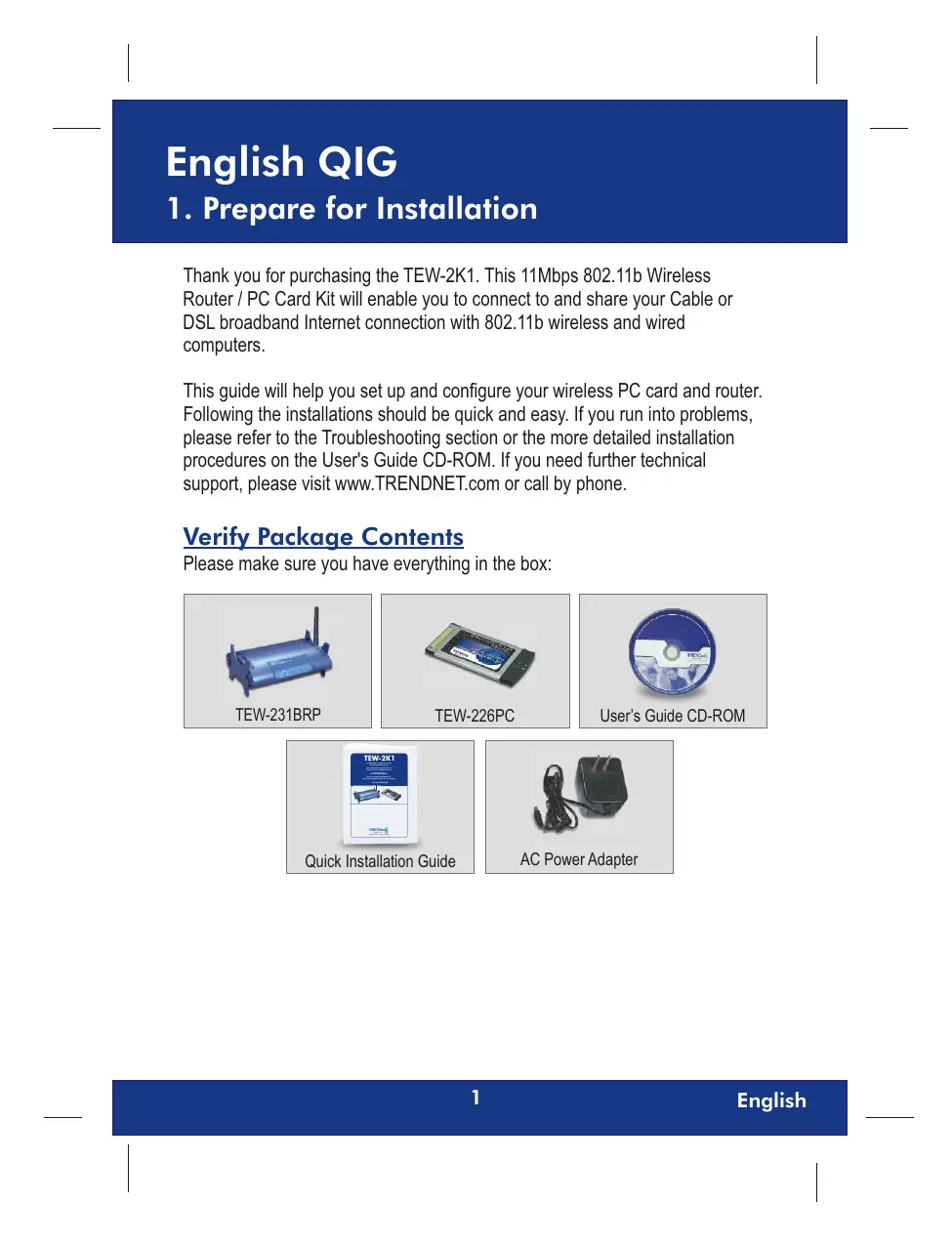This guide will help you set up and configure your wireless PC card and router. Following the installations should be quick and easy. If you run into problems, please refer to the Troubleshooting section or the more detailed installation procedures on the User's Guide CD-ROM. If you need further technical support, please visit www.TRENDNET.com or call by phone.