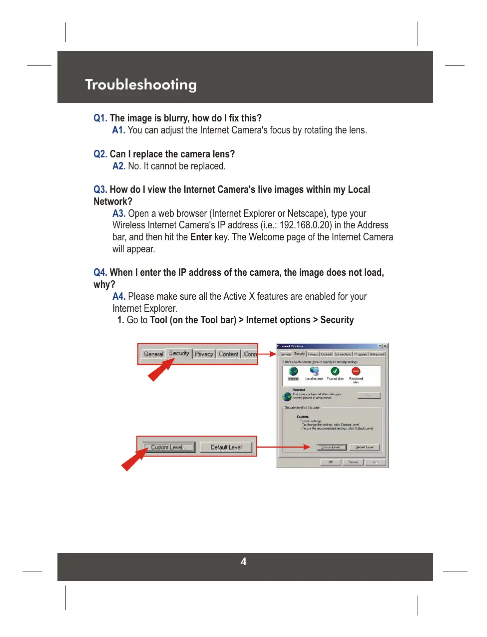 Troubleshooting Q1. The image is blurry, how do I fix this? A1. You can adjust the Internet Camera's focus by rotating the lens. Q2. Can I replace the camera lens? A2. No. It cannot be replaced. Q3. How do I view the Internet Camera's live images within my Local Network? A3. Open a web browser (Internet Explorer or Netscape), type your Wireless Internet Camera's IP address (i.e.: 192.168.0.20) in the Address bar, and then hit the Enter key. The Welcome page of the Internet Camera will appear. Q4. When l enter the IP address of the camera, the image does not load, why? A4. Please make sure all the Active X features are enabled for your Internet Explorer.