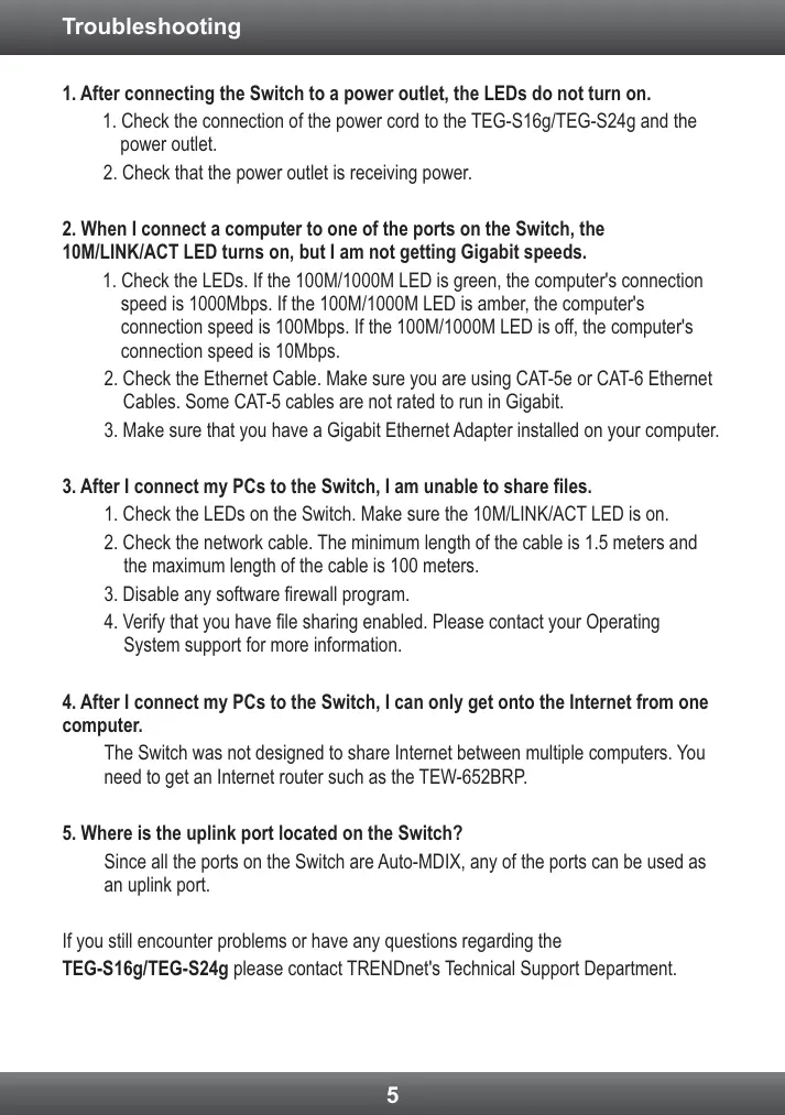 Troubleshooting 1. After connecting the Switch to a power outlet, the LEDs do not turn on. 1. Check the connection of the power cord to the TEG-S16g/TEG-S24g and the power outlet. 2. Check that the power outlet is receiving power. 2. When I connect a computer to one of the ports on the Switch, the 10M/LINK/ACT LED turns on, but I am not getting Gigabit speeds. 1. Check the LEDs. If the 100M/1000M LED is green, the computer's connection speed is 1000Mbps. If the 100M/1000M LED is amber, the computer's connection speed is 100Mbps. If the 100M/1000M LED is off, the computer's connection speed is 10Mbps. 2. Check the Ethernet Cable. Make sure you are using CAT-5e or CAT-6 Ethernet Cables. Some CAT-5 cables are not rated to run in Gigabit. 3. Make sure that you have a Gigabit Ethernet Adapter installed on your computer. 3. After I connect my PCs to the Switch, I am unable to share files. 1. Check the LEDs on the Switch. Make sure the 10M/LINK/ACT LED is on. 2. Check the network cable. The minimum length of the cable is 1.5 meters and the maximum length of the cable is 100 meters. 3. Disable any software firewall program. 4. Verify that you have file sharing enabled. Please contact your Operating System support for more information. 4. After I connect my PCs to the Switch, I can only get onto the Internet from one computer. The Switch was not designed to share Internet between multiple computers. You need to get an Internet router such as the TEW-652BRP. 5. Where is the uplink port located on the Switch? Since all the ports on the Switch are Auto-MDIX, any of the ports can be used as an uplink port. If you still encounter problems or have any questions regarding the TEG-S16g/TEG-S24g please contact TRENDnet's Technical Support Department.