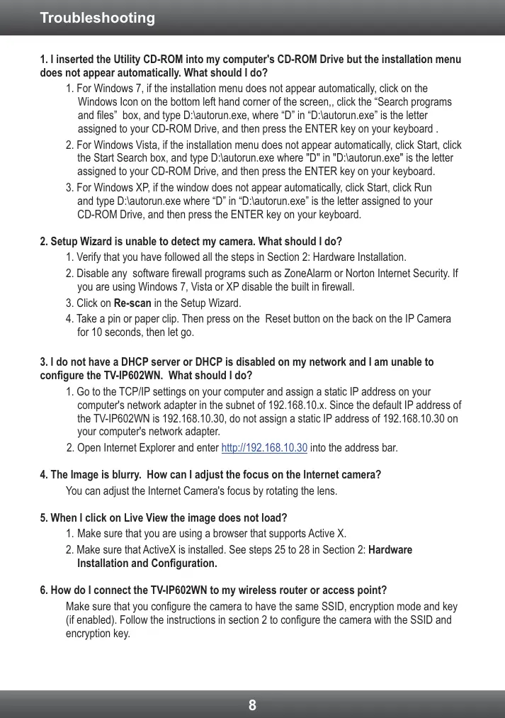 If you still encounter problems or have any questions regarding the TV-IP602WN, please contact TRENDnet's Technical Support Department.