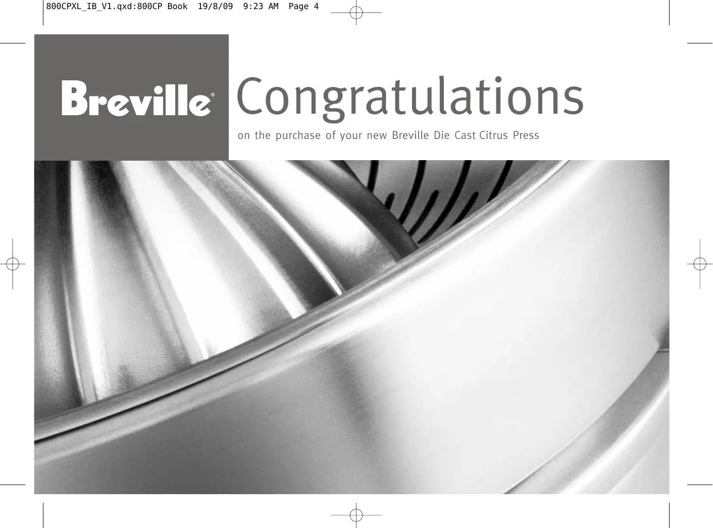 800CPXL_IB_V1.qxd:800CP Book 19/8/09 9:23 AM Page 5 e From its superbly crafted and ultra-quiet motor right through to its professionally styled casing, your Die Cast Citrus Press represents a perfect balance of functionality, reliability and absolute style. In developing this booklet our goal was to provide you with the perfect point from which you can start exploring the fabulous benefits of the innovative 800CPXL. We hope each page of this booklet helps you gain enormous pleasure from a new world of fresh citrus juicing. We would just like to say thank you and... enjoy.