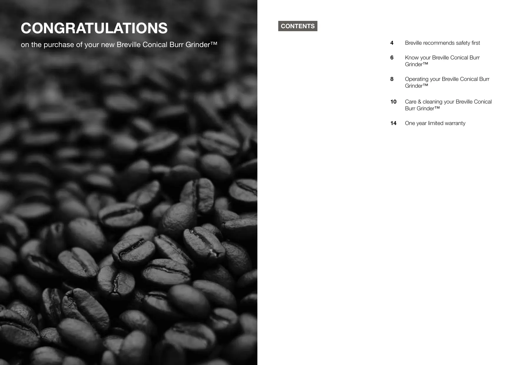 CONGRATULATIONS on the purchase of your new Breville Conical Burr Grinder™ CONTENTS