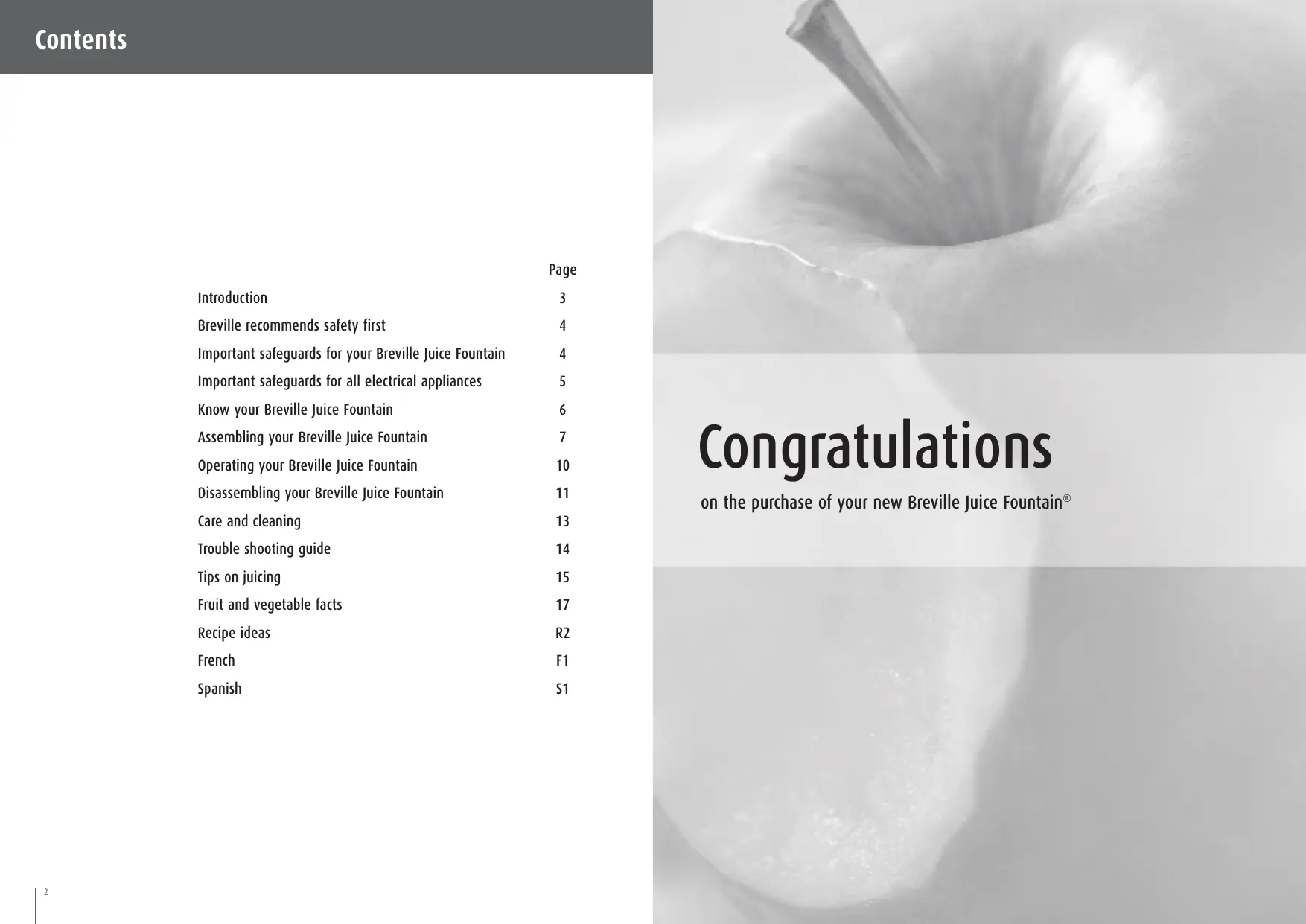 Introduction Breville recommends safety first Important safeguards for your Breville Juice Fountain Important safeguards for all electrical appliances Know your Breville Juice Fountain Assembling your Breville Juice Fountain Operating your Breville Juice Fountain Disassembling your Breville Juice Fountain Care and cleaning Trouble shooting guide Tips on juicing Fruit and vegetable facts Recipe ideas French Spanish Congratulations on the purchase of your new Breville Juice Fountain®
