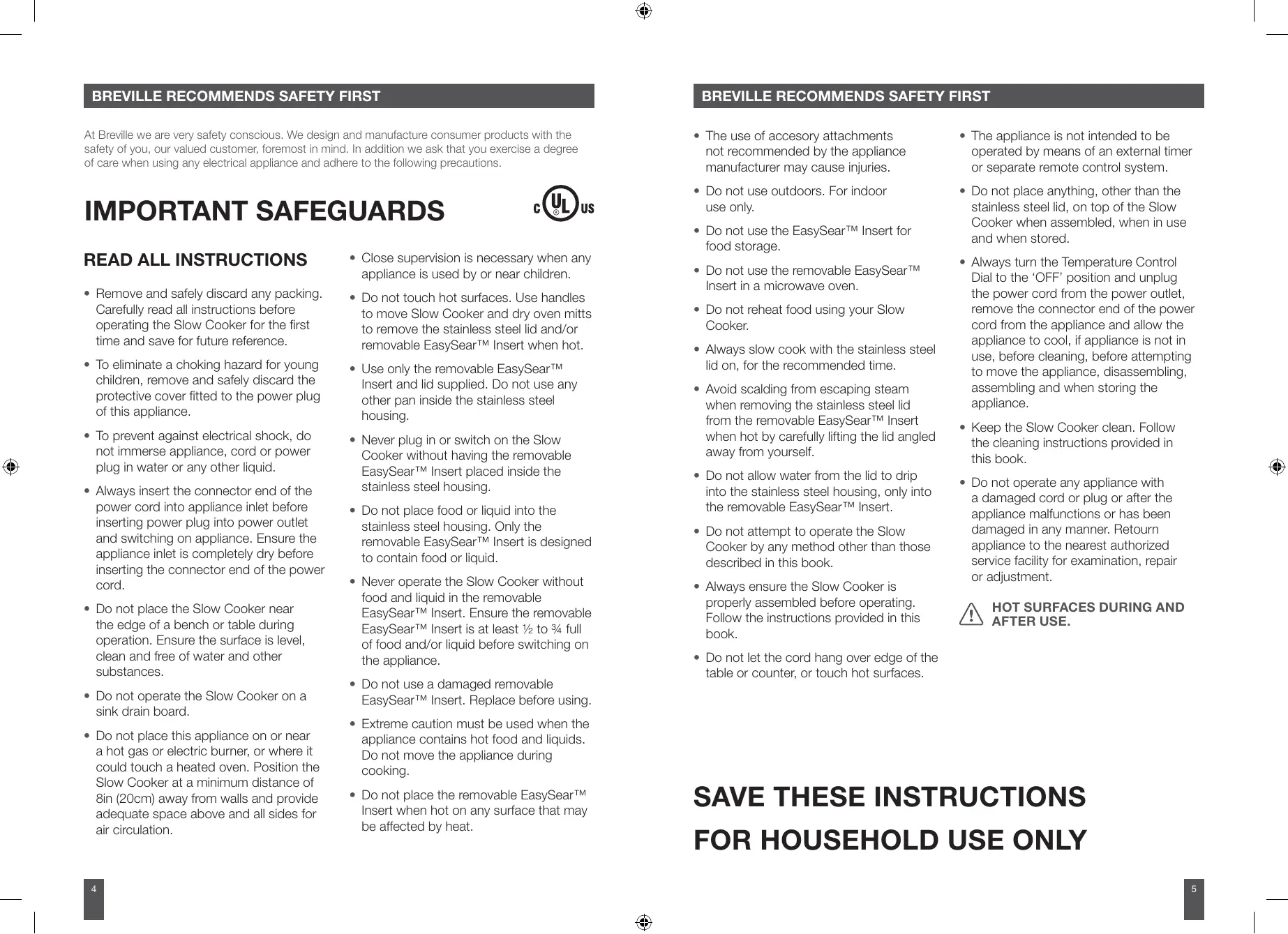 KNOW your new Breville Slow Cooker Know Your Breville SLOW COOKER Domed Stainless Steel Lid suitable for use in the oven Removable Die-Cast EasySear™ Insert designed for searing on the stovetop, slow cooking and roasting in the oven Quantanium Non-Stick for easy cleaning Temperature Control Dial for ease and simplicity Brushed Stainless Steel Housing Extra Large 7-qt (6.5 L) Capacity for family sized meals Silicon Handle Covers for heat protection Wrap Around Element ensures an even temperature throughout the cooking process Stainless Steel Rack for Roasting Removable Cord for serving at the table and easy storage (not shown)