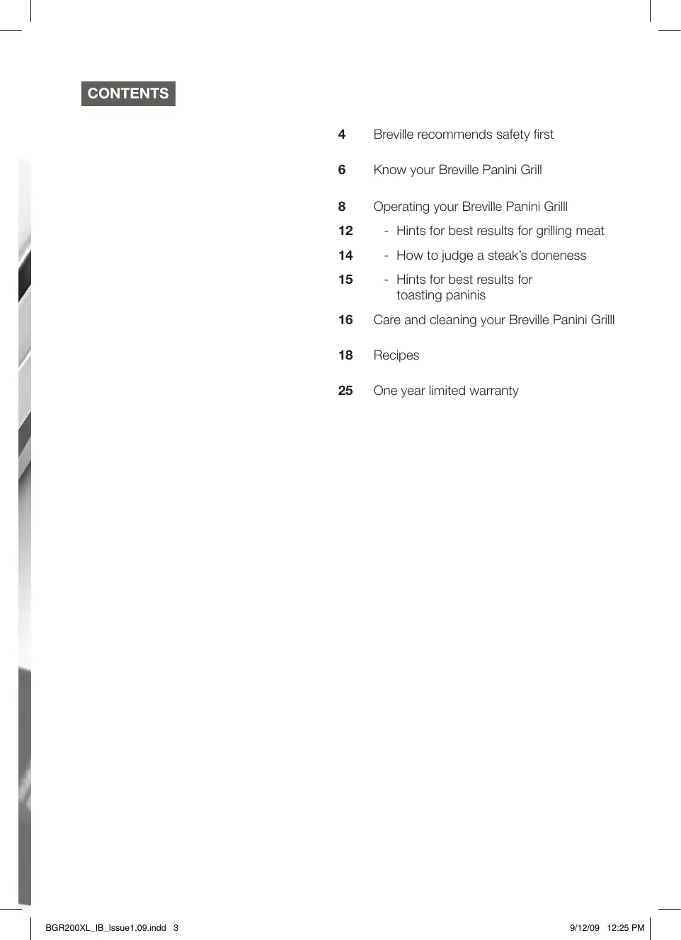 toasting paninis 16 Care and cleaning your Breville Panini Grilll 18 Recipes 25 One year limited warranty BGR200XL_IB_Issue1,09.ndd 3 9/12/09 12:25 PM