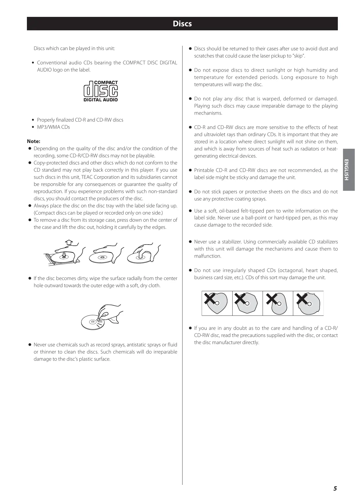 Discs Discs which can be played in this unit: M Conventional audio CDs bearing the COMPACT DISC DIGITAL AUDIO logo on the label. < Discs should be returned to their cases after use to avoid dust and scratches that could cause the laser pickup to ”skip”. < Do not expose discs to direct sunlight or high humidity and temperature for extended periods. Long exposure to high temperatures will warp the disc. < Do not play any disc that is warped, deformed or damaged. Playing such discs may cause irreparable damage to the playing mechanisms. M Properly finalized CD-R and CD-RW discs M MP3/WMA CDs < Printable CD-R and CD-RW discs are not recommended, as the label side might be sticky and damage the unit. < Do not stick papers or protective sheets on the discs and do not use any protective coating sprays. < Use a soft, oil-based felt-tipped pen to write information on the label side. Never use a ball-point or hard-tipped pen, as this may cause damage to the recorded side. < Never use a stabilizer. Using commercially available CD stabilizers with this unit will damage the mechanisms and cause them to malfunction. < If the disc becomes dirty, wipe the surface radially from the center hole outward towards the outer edge with a soft, dry cloth. < Never use chemicals such as record sprays, antistatic sprays or fluid or thinner to clean the discs. Such chemicals will do irreparable damage to the disc’s plastic surface. < Do not use irregularly shaped CDs (octagonal, heart shaped, business card size, etc.). CDs of this sort may damage the unit. < If you are in any doubt as to the care and handling of a CD-R/ CD-RW disc, read the precautions supplied with the disc, or contact the disc manufacturer directly.
