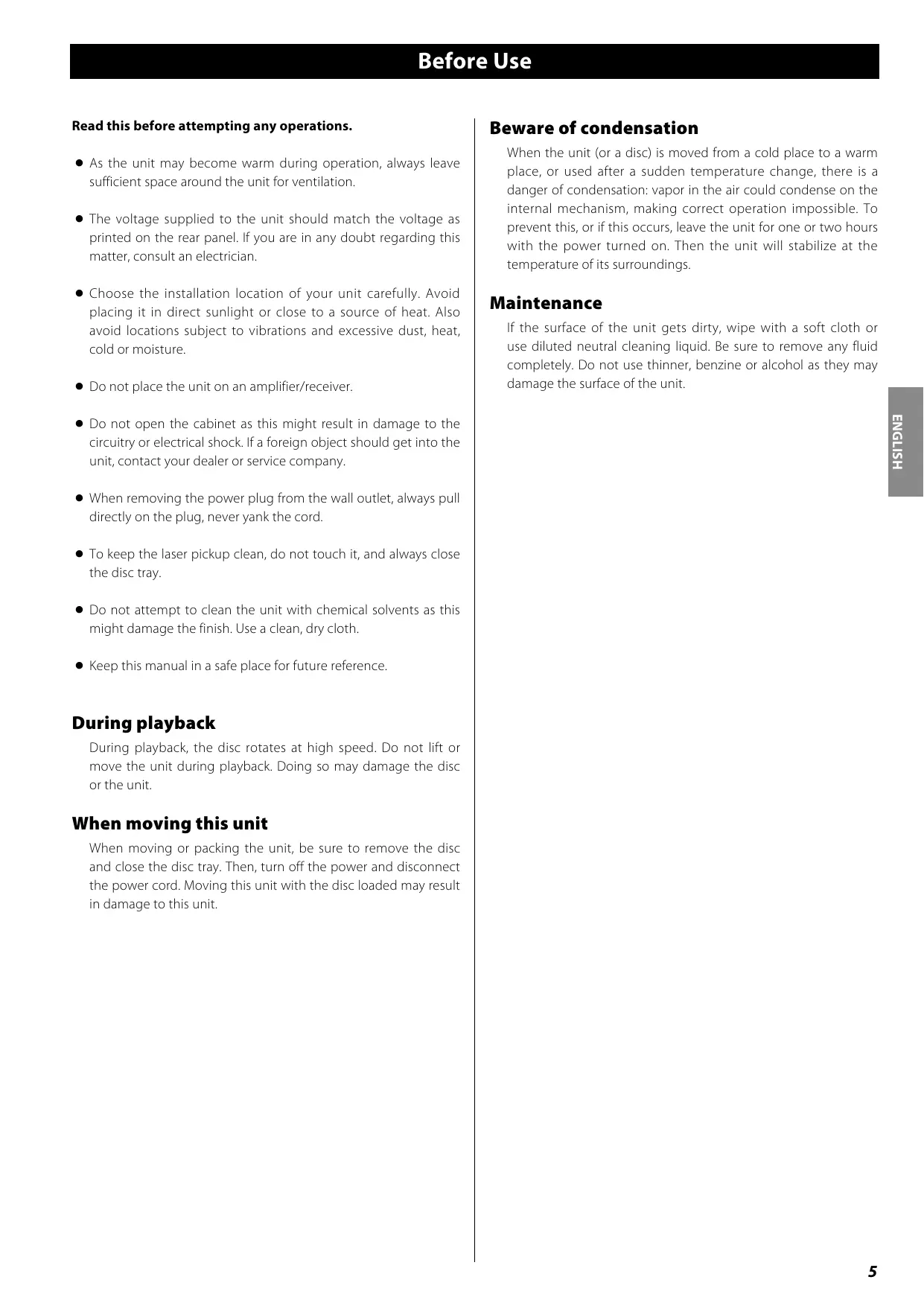 Before Use Read this before attempting any operations. < As the unit may become warm during operation, always leave sufficient space around the unit for ventilation. < The voltage supplied to the unit should match the voltage as printed on the rear panel. If you are in any doubt regarding this matter, consult an electrician. < Choose the installation location of your unit carefully. Avoid placing it in direct sunlight or close to a source of heat. Also avoid locations subject to vibrations and excessive dust, heat, cold or moisture. < Do not place the unit on an amplifier/receiver. Beware of condensation When the unit (or a disc) is moved from a cold place to a warm place, or used after a sudden temperature change, there is a danger of condensation: vapor in the air could condense on the internal mechanism, making correct operation impossible. To prevent this, or if this occurs, leave the unit for one or two hours with the power turned on. Then the unit will stabilize at the temperature of its surroundings. Maintenance If the surface of the unit gets dirty, wipe with a soft cloth or use diluted neutral cleaning liquid. Be sure to remove any fluid completely. Do not use thinner, benzine or alcohol as they may damage the surface of the unit. ENGLISH < Do not open the cabinet as this might result in damage to the circuitry or electrical shock. If a foreign object should get into the unit, contact your dealer or service company. < When removing the power plug from the wall outlet, always pull directly on the plug, never yank the cord. < To keep the laser pickup clean, do not touch it, and always close the disc tray. < Do not attempt to clean the unit with chemical solvents as this might damage the finish. Use a clean, dry cloth. < Keep this manual in a safe place for future reference. During playback During playback, the disc rotates at high speed. Do not lift or move the unit during playback. Doing so may damage the disc or the unit. When moving this unit When moving or packing the unit, be sure to remove the disc and close the disc tray. Then, turn off the power and disconnect the power cord. Moving this unit with the disc loaded may result in damage to this unit.