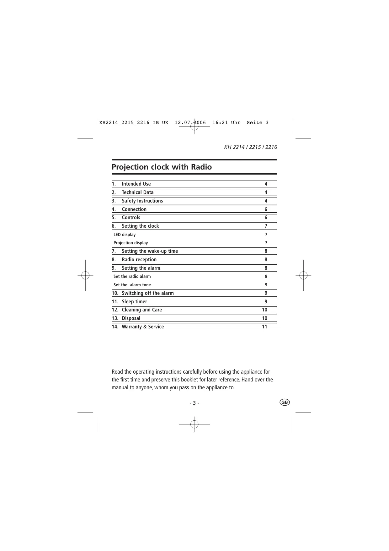 Download the instructions for your Projection Alarm Clock in PDF format for free! Find your manual KH 2214 - EBENCH and take your electronic device back in hand. On this page are published all the documents necessary for the use of your device. KH 2214 by EBENCH.