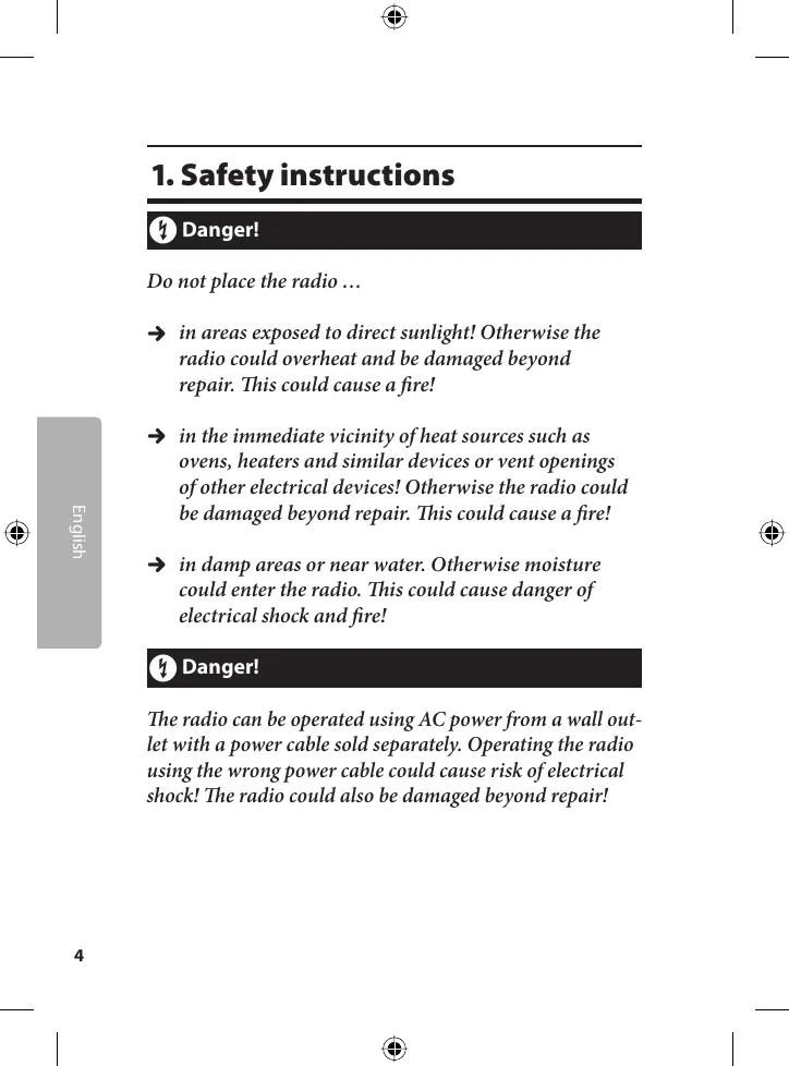 in the immediate vicinity of heat sources such as ovens, heaters and similar devices or vent openings of other electrical devices! Otherwise the radio could be damaged beyond repair. This could cause a fire!