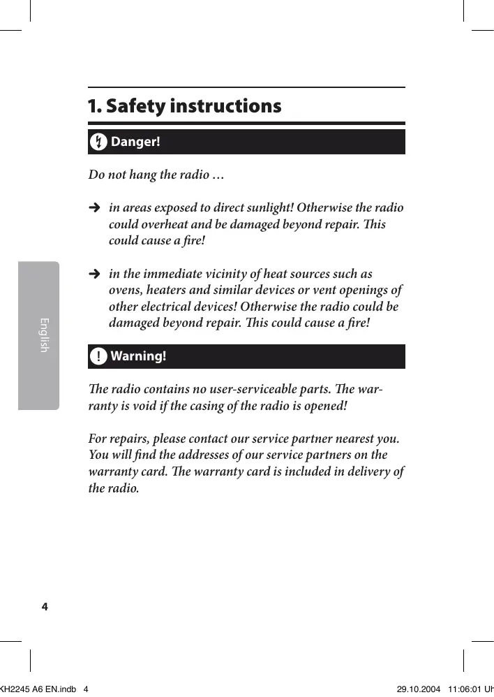 Do not hang the radio … + in areas exposed to direct sunlight! Otherwise the radio could overheat and be damaged beyond repair. This could cause a fire! + in the immediate vicinity of heat sources such as ovens, heaters and similar devices or vent openings of other electrical devices! Otherwise the radio could be damaged beyond repair. This could cause a fire! The radio contains no user-serviceable parts. The war- ranty is void if the casing of the radio is opened! For repairs, please contact our service partner nearest you. You will find the addresses of our service partners on the warranty card. The warranty card is included in delivery of the radio. <H2245 A6 ENindb 4 29.10.2004 11:06:01 UF
