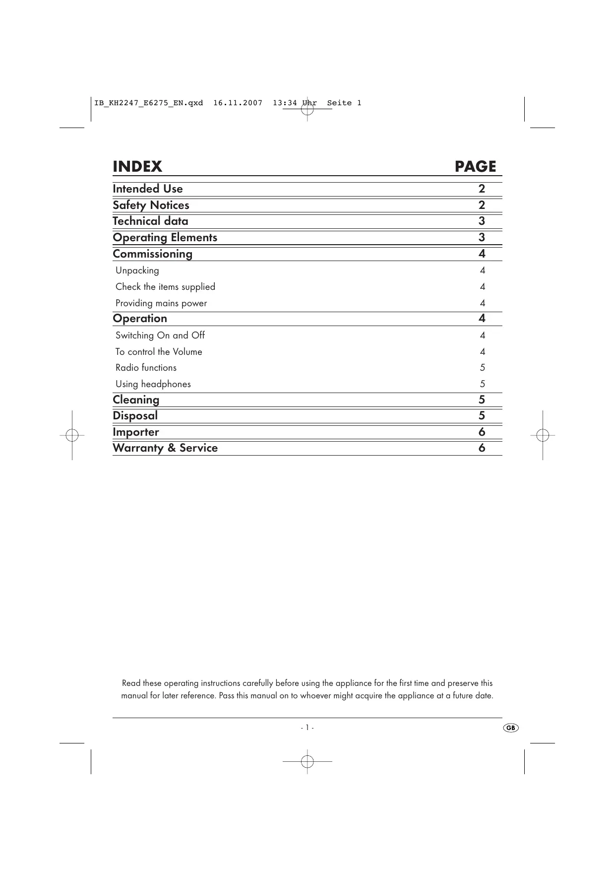 Safety Notices Technical data Operating Elements Commissioning Unpacking Check the items supplied Providing mains power Operation Switching On and Off To control the Volume Radio functions Using headphones Cleaning Disposal Importer Warranty & Service oo lüliunl u Ou 5 R|blr à à [Bol CN Read these operating instructions carefully before using the appliance for the first time and preserve this manual for later reference. Pass this manual on to whoever might acquire the appliance at a future date.