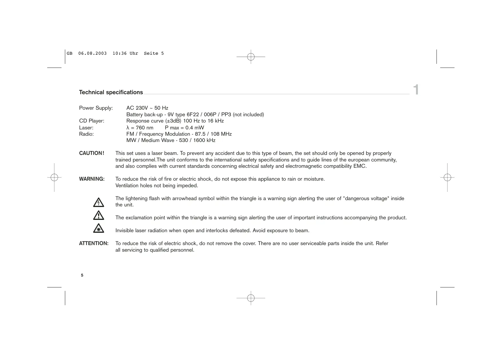 ATTENTION: AC 230V - 50 Hz Battery back-up - OV type 6F22 / 006P / PP3 (not included) Response curve (43dB) 100 Hz to 16 kHz ÀA=760nm P max = 0.4mW FM / Frequency Modulation - 87.5 / 108 MHz MW / Medium Wave - 530 / 1600 kHz This set uses a laser beam. To prevent any accident due to this type of beam, the set should only be opened by properly trained personnel. The unit conforms to the international safety specifications and to guide lines of the european community, and also complies with current standards concerning electrical safety and electromagnetic compatibility EMC. To reduce the risk of fire or electric shock, do not expose this appliance to rain or moisture. Ventilation holes not being impeded. The lightening flash with arrowhead symbol within the triangle is a warning sign alerting the user of "dangerous voltage" inside the unit. The exclamation point within the triangle is a warning sign alerting the user of important instructions accompanying the product. Invisible laser radiation when open and interlocks defeated. Avoid exposure to beam. To reduce the risk of electric shock, do not remove the cover. There are no user serviceable parts inside the unit. Refer ll servicing to qualified personnel.