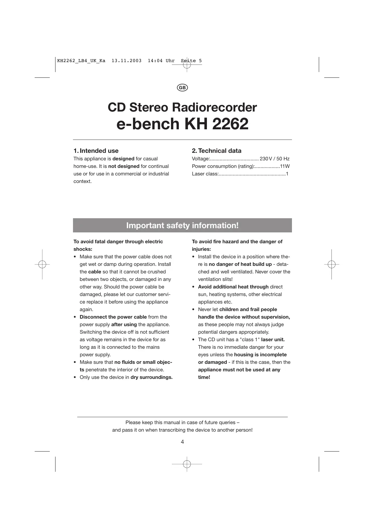 KH 2262 - CD player radio EBENCH - Free user manual and instructions