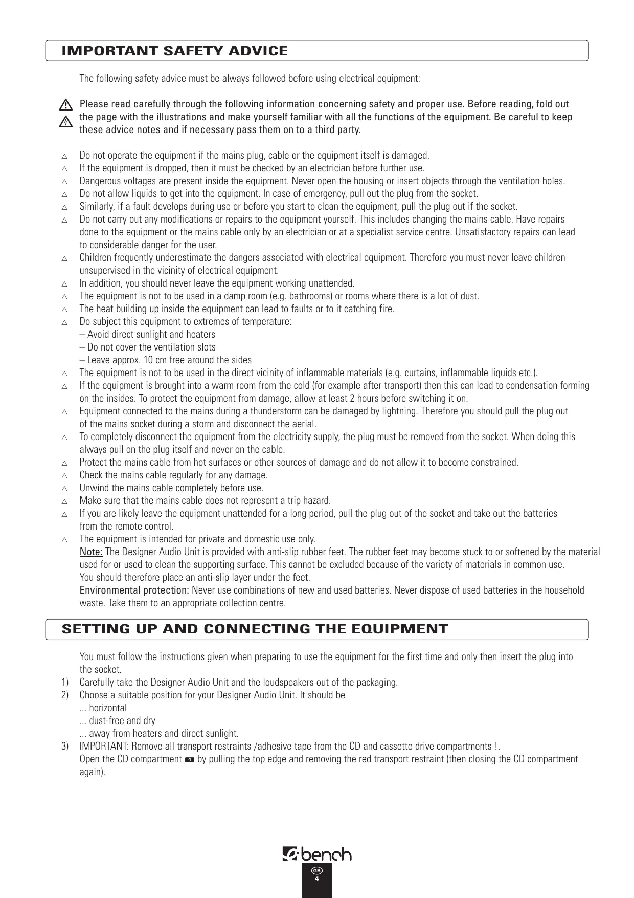 The following safety advice must be always followed before using electrical equipment: À Please read carefully through the following information concerning safety and proper use. Before reading, fold out A the page with the illustrations and make yourself familiar with all the functions of the equipment. Be careful to keep these advice notes and if necessary pass them on to a third party. A Do not operate the equipment if the mains plug, cable or the equipment itself is damaged. A lfthe equipment is dropped, then it must be checked by an electrician before further use. A Dangerous voltages are present inside the equipment. Never open the housing or insert objects through the ventilation holes A Do not allow liquids to get into the equipment. In case of emergency, pull out the plug from the socket. A Similarly, if a fault develops during use or before you start to clean the equipment, pull the plug out if the socket. A Do not carry out any modifications or repairs to the equipment yourself. This includes changing the mains cable. Have repairs done to the equipment or the mains cable only by an electrician or at a specialist service centre. Unsatisfactory repairs can lead to considerable danger for the user. A Children frequently underestimate the dangers associated with electrical equipment. Therefore you must never leave children unsupervised in the vicinity of electrical equipment. A In addition, you should never leave the equipment working unattended A The equipment is not to be used in a damp room (e.g. bathrooms) or rooms where there is a lot of dust. A The heat building up inside the equipment can lead to faults or to it catching fire. A Do subject this equipment to extremes of temperature: — Avoid direct sunlight and heaters — Do not cover the ventilation slots — Leave approx. 10 cm free around the sides A The equipment is not to be used in the direct vicinity of inflammable materials (e.g. curtains, inflammable liquids etc.). A lfthe equipment is brought into a warm room from the cold [for example after transport} then this can lead to condensation forming on the insides. To protect the equipment from damage, allow at least 2 hours before switching it on A Equipment connected to the mains during a thunderstorm can be damaged by lightning. Therefore you should pull the plug out of the mains socket during a storm and disconnect the aerial. A To completely disconnect the equipment from the electricity supply, the plug must be removed from the socket. When doing this always pull on the plug itself and never on the cable A Protect the mains cable from hot surfaces or other sources of damage and do not allow it to become constrained. A Check the mains cable regularly for any damage. A Unwind the mains cable completely before use. A Make sure that the mains cable does not represent a trip hazard. Alf you are likely leave the equipment unattended for a long period, pull the plug out of the socket and take out the batteries from the remote control. A The equipment is intended for private and domestic use only. Note: The Designer Audio Unit is provided with anti-slip rubber feet. The rubber feet may become stuck to or softened by the material used for or used to clean the supporting surface. This cannot be excluded because of the variety of materials in common use. You should therefore place an anti-slip layer under the feet. Environmental protection: Never use combinations of new and used batteries. Never dispose of used batteries in the household waste. Take them to an appropriate collection centre.