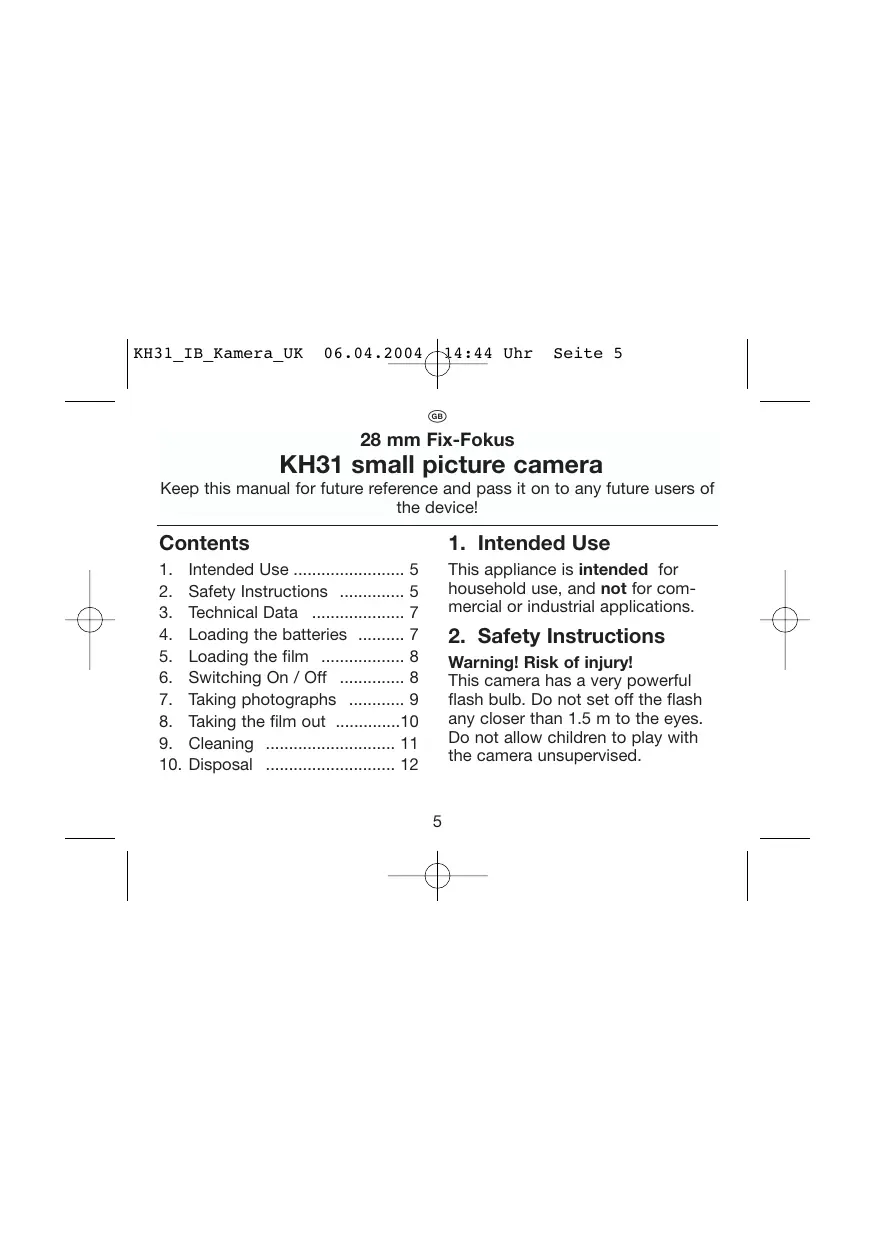 28 mm Fix-Fokus KH31 small picture camera Keep this manual for future reference and pass it on to any future users of the device! Contents intended Use Safety Instructions . Technical Data . Loading the batteries Loading the film Switching On / Off . Taking photographs Taking the film out Cleaning . Disposal .
