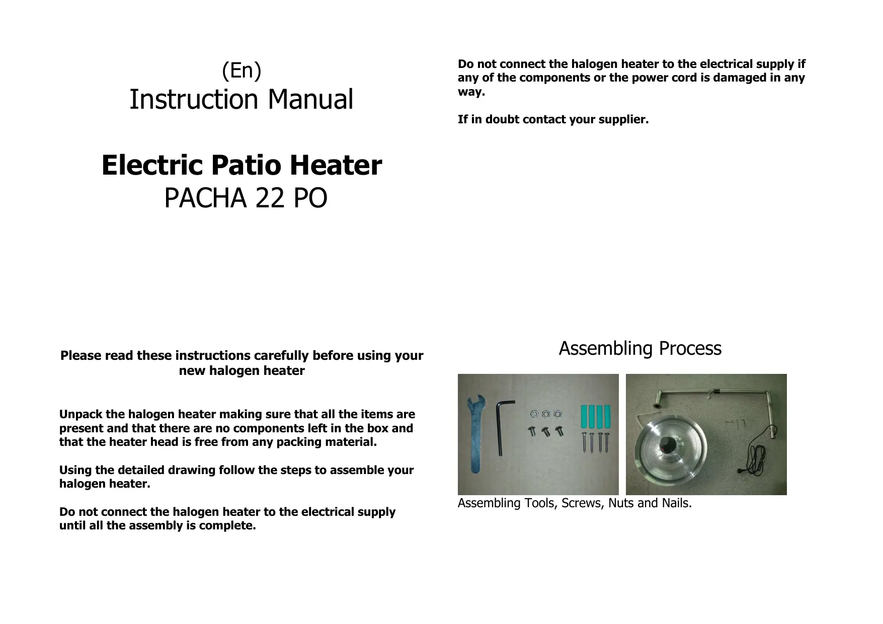 sûreté. - Alimentation : 230 V – 50 Hz - 2 100 Watts - Poids net : 7,8 kg - Classé : I DECLARATION DE CONFORMITE : La déclaration de conformité est nécessaire pour certifier que le chauffage halogène est bien conforme aux standards suivants : IEC/EN55014-1; IEC/EN 55014-2; IEC/EN61000-3-2; IEC/EN61000-3-3; IEC/ EN60335-1; IEC/EN60335-2-30 IP44D (En) Instruction Manual Do not connect the halogen heater to the electrical supply if any of the components or the power cord is damaged in any way. If in doubt contact your supplier. Electric Patio Heater PACHA 22 PO Please read these instructions carefully before using your new halogen heater Assembling Process Unpack the halogen heater making sure that all the items are present and that there are no components left in the box and that the heater head is free from any packing material. Using the detailed drawing follow the steps to assemble your halogen heater. Do not connect the halogen heater to the electrical supply until all the assembly is complete. Assembling Tools, Screws, Nuts and Nails. Step 1: Feed the power cord through the pole, and fix the pole on the heater head by using 3PCS M6 Screw Nuts. Complete! Attention: The unit must be placed with the clearance of 180cm to the floor and 30cm to the ceiling. Caution Only use the halogen heater on a firm solid vertical wall where the Mounting Bar is in contact with the wall. (Should the heater be tilted or fall over the auto cut off switch will activate) Step 2: Connect the Power Cord to the socket, and connect the pole by using 3PCS M6*10 bolts. Step 3: Fix the pole on the wall by using the 4PCS Nails.