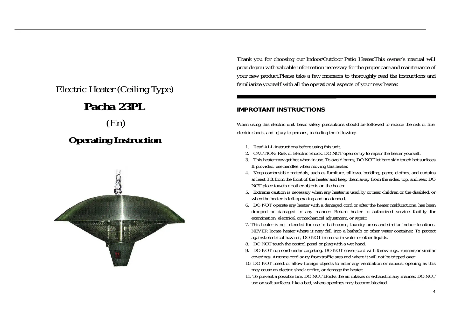 Electric Heater (Ceiling Type) Pacha 23PL (En) Thank you for choosing our Indoor/Outdoor Patio Heater.This owner’s manual will provide you with valuable information necessary for the proper care and maintenance of your new product.Please take a few moments to thoroughly read the instructions and familiarize yourself with all the operational aspects of your new heater. IMPROTANT INSTRUCTIONS When using this electric unit, basic safety precautions should be followed to reduce the risk of fire, electric shock, and injury to persons, including the following: Operating Instruction