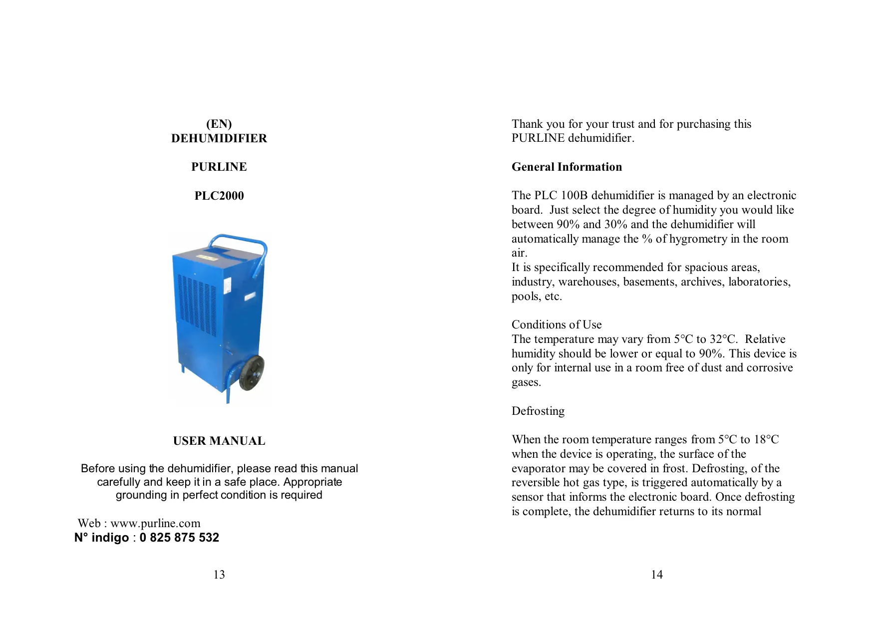 d e fro st ind ica tor o n/o ff b utt on H U M I D IT Y UP H U MI DI T Y D O W N H UM ID I T Y % Memo ry humidity up humidity down Thank you for your trust and for purchasing this PURLINE dehumidifier. PURLINE General Information PLC2000 The PLC 100B dehumidifier is managed by an electronic board. Just select the degree of humidity you would like between 90% and 30% and the dehumidifier will automatically manage the % of hygrometry in the room air. It is specifically recommended for spacious areas, industry, warehouses, basements, archives, laboratories, pools, etc. Conditions of Use The temperature may vary from 5°C to 32°C. Relative humidity should be lower or equal to 90%. This device is only for internal use in a room free of dust and corrosive gases. Defrosting USER MANUAL Before using the dehumidifier, please read this manual carefully and keep it in a safe place. Appropriate grounding in perfect condition is required When the room temperature ranges from 5°C to 18°C when the device is operating, the surface of the evaporator may be covered in frost. Defrosting, of the reversible hot gas type, is triggered automatically by a sensor that informs the electronic board. Once defrosting is complete, the dehumidifier returns to its normal operations. The device can therefore operate in relatively low room temperatures. Safety instructions : Please read the instruction carefully before operation.