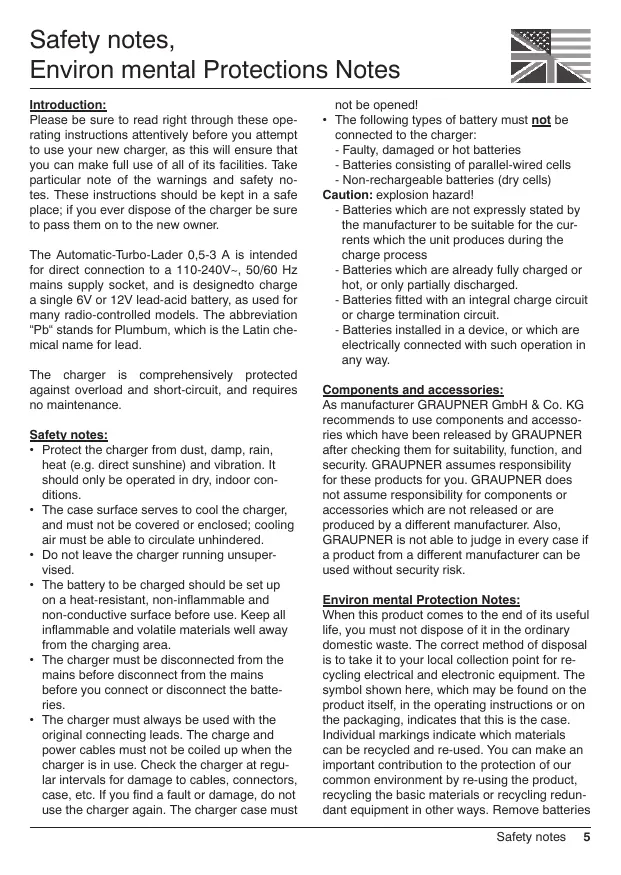 Components and accessories: A manufacturer GRAUPNER GmbH & Co. KG recommends to use components and accesso- ries which have been released by GRAUPNER after checking them for suitabilty, function, and security. GRAUPNER assumes responsibility for these products for you. GRAUPNER does not assume responsibility for components or accessories which are not released or are produced by a different manufacturer. AISO, GRAUPNER is not able Lo judge in every case if a product from a different manufacturer can be used without security risk.