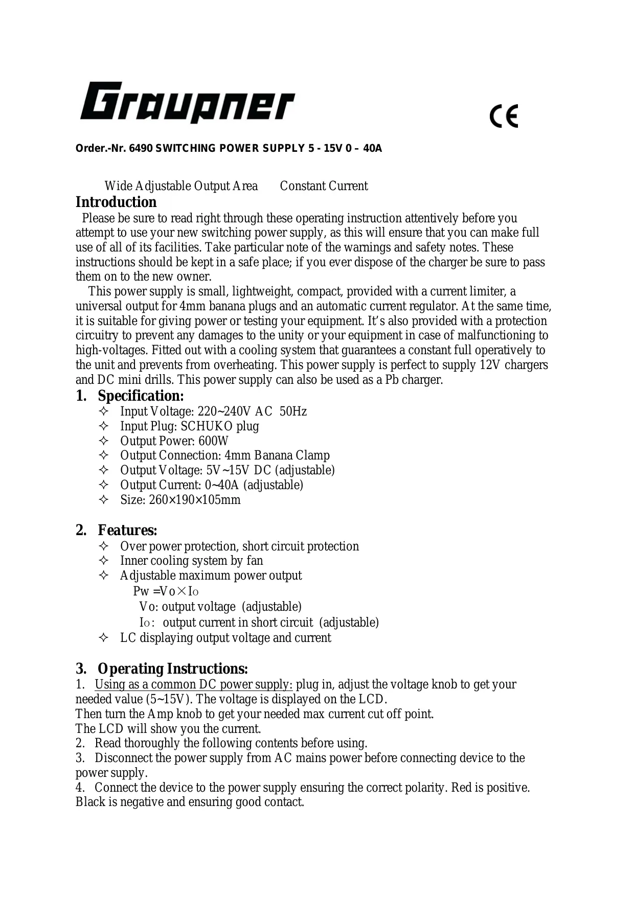 Order.-Nr. 6490 SWITCHING POWER SUPPLY 5 - 15V 0 - 40A Wide A djustable Output Area Constant Current Introduction Please be sure to read right through these operating instruction attentively before you attempt to use your new switching power supply, as this will ensure that you can make full use of all of its facilities. Take particular note of the warnings and safety notes. These instructions should be kept in a safe place; if you ever dispose of the charger be sure to pass them on to the new owner.