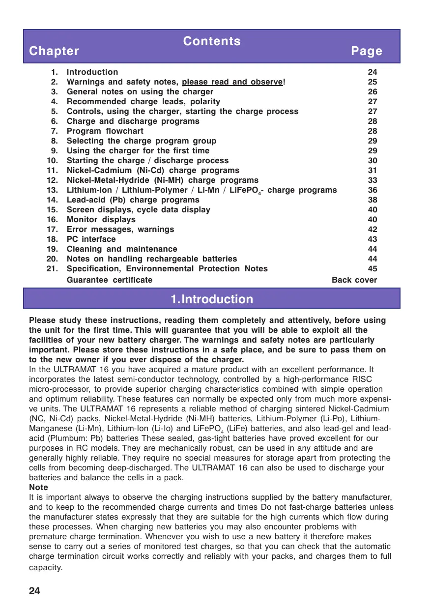 Guarantee certificate Back cover 1.Introd n Please study these instructions, reading them completely and attentively, before using the unit for the first time. This will guarantee that you will be able to exploit all the facilities of your new battery charger. The warnings and safety notes are particularly important. Please store these instructions in a safe place, and be sure to pass them on to the new owner if you ever dispose of the charger. In the ULTRAMAT 16 you have acquired a mature product with an excellent performance. It incorporates the latest semi-conductor technology, controlled by a high-performance RISC micro-processor, to provide superior charging characteristics combined with simple operation and optimum reliability. These features can normally be expected only from much more expensi- ve units. The ULTRAMAT 16 represents a reliable method of charging sintered Nickel-Cadmium (NC, Ni-Cd) packs, Nickel-Metal-Hydride (Ni-MH) batteries, Lithium-Polymer (Li-Po), Lithium- Manganese (Li-Mn), Lithium-lon (Li-lo) and LiFePO, (LiFe) batteries, and also lead-gel and lead- acid (Plumbum: Pb) batteries These sealed, gas-tight batteries have proved excellent for our purposes in RC models. They are mechanically robust, can be used in any attitude and are generally highly reliable. They require no special measures for storage apart from protecting the cells from becoming deep-discharged. The ULTRAMAT 16 can also be used to discharge your batteries and balance the cells in à pack. Note Itis important always to observe the charging instructions supplied by the battery manufacturer, and to keep to the recommended charge currents and times Do not fast-charge batteries unless the manufacturer states expressly that they are suitable for the high currents which flow during these processes. When charging new batteries you may also encounter problems with premature charge termination. Whenever you wish to use a new battery it therefore makes sense to carry out a series of monitored test charges, so that you can check that the automatic charge termination circuit works correctly and reliably with your packs, and charges them to full capacity.