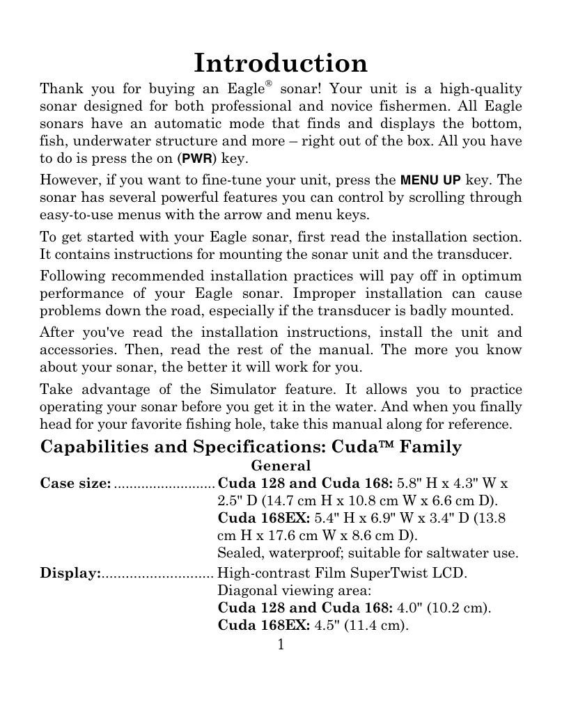 Introduction Thank you for buying an Eagle® sonar! Your unit is a high-quality sonar designed for both professional and novice fishermen. All Eagle sonars have an automatic mode that finds and displays the bottom, fish, underwater structure and more — right out of the box. All you have to dois press the on (PWR) key. However, if you want to fine-tune your unit, press the MENU UP key. The sonar has several powerful features you can control by scrolling through easy-to-use menus with the arrow and menu keys. To get started with your Eagle sonar, first read the installation section. It contains instructions for mounting the sonar unit and the transducer. Following recommended installation practices will pay off in optimum performance of your Eagle sonar. Improper installation can cause problems down the road, especially if the transducer is badly mounted. After you've read the installation instructions, install the unit and accessories. Then, read the rest of the manual. The more you know about your sonar, the better it will work for you. Take advantage of the Simulator feature. It allows you to practice operating your sonar before you get it in the water. And when you finally head for your favorite fishing hole, take this manual along for reference. Capabilities and Specifications: CudaM Family General Cuda 128 and Cuda 168: 5.8" H x 4.3" W x 2.5" D (14.7 cm H x 10.8 cm W x 6.6 cm D). Cuda 168EX: 5.4" H x 6.9" W x 3.4" D (13.8 em H x 17.6 cm W x 8.6 cm D). Sealed, waterproof; suitable for saltwater use. … High-contrast Film SuperTwist LCD. Diagonal viewing area: Cuda 128 and Cuda 168: 4.0" (10.2 cm). Cuda 168EX: 4.5" (11.4 cm).
