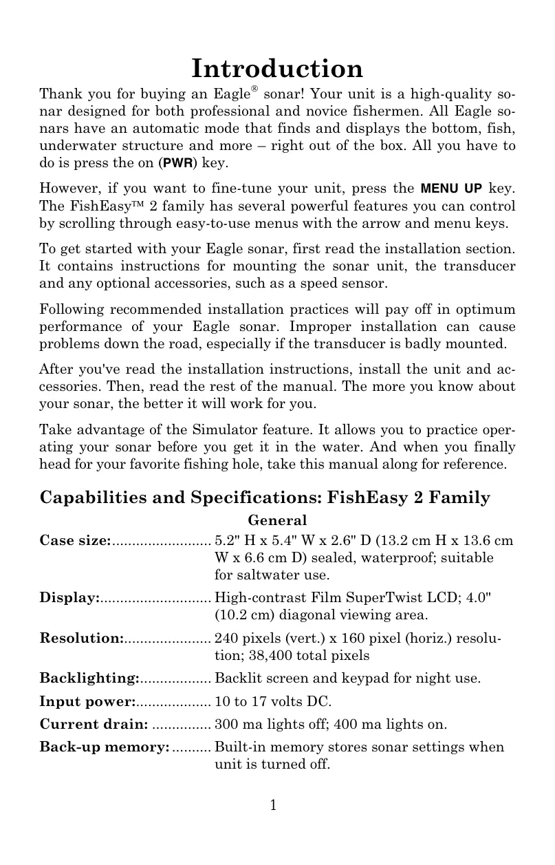 Introduction Thank you for buying an Eagle* sonar! Your unit is a high-quality so- nar designed for both professional and novice fishermen. All Eagle s0- nars have an automatic mode that finds and displays the bottom, fish, underwater structure and more — right out of the box. All you have to do is press the on (PWR) key. However, if you want to fine-tune your unit, press the MENU UP key. The FishEasy" 2 family has several powerful features you can control by scrolling through easy-to-use menus with the arrow and menu keys. To get started with your Eagle sonar, first read the installation section. It contains instructions for mounting the sonar unit, the transducer and any optional accessories, such as a speed sensor. Following recommended installation practices will pay off in optimum performance of your Eagle sonar. Improper installation can cause problems down the road, especially if the transducer is badly mounted. After you've read the installation instructions, install the unit and ac- cessories. Then, read the rest of the manual. The more you know about your sonar, the better it will work for you. Take advantage of the Simulator feature. It allows you to practice oper- ating your sonar before you get it in the water. And when you finally head for your favorite fishing hole, take this manual along for reference. Capabilities and Specifications: FishEasy 2 Family General 5.2"H x 5.4" W x 2.6" D (13.2 cm H x 13.6 cm W x 6.6 cm D) sealed, waterproof; suitable for saltwater use. Display: .… High-contrast Film SuperTwist LCD; 4.0" (10.2 cm) diagonal viewing area. Resolution: 240 pixels (vert.) x 160 pixel (horiz.) resolu- tion; 38,400 total pixels .… Backlit screen and keypad for night use. 10 to 17 volts DC. 300 ma lights off; 400 ma lights on. Input power: Current drai .… Built-in memory stores sonar settings when unit is turned off. Back-up memory: