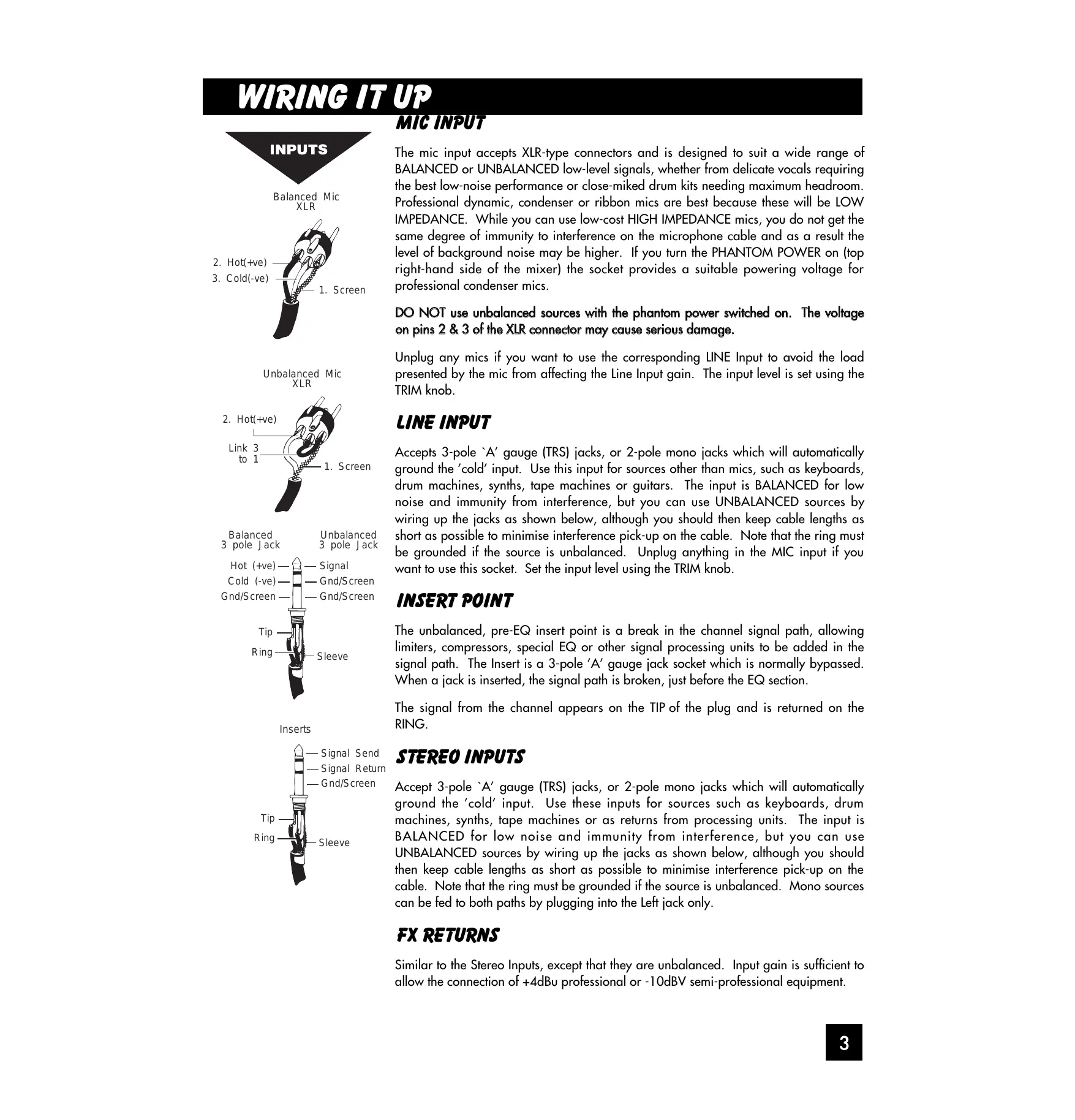 MIC INPUT Balanced Mic XLR The mic input accepts XLR-type connectors and is designed to suit a wide range of BALANCED or UNBALANCED low-level signals, whether from delicate vocals requiring the best low-noise performance or close-miked drum kits needing maximum headroom. Professional dynamic, condenser or ribbon mics are best because these will be LOW IMPEDANCE. While you can use low-cost HIGH IMPEDANCE mics, you do not get the same degree of immunity to interference on the microphone cable and as a result the level of background noise may be higher. If you turn the PHANTOM POWER on (top right-hand side of the mixer) the socket provides a suitable powering voltage for professional condenser mics. DO NOT use unbalanced sources with the phantom power switched on. The voltage on pins 2 & 3 of the XLR connector may cause serious damage. Unbalanced Mic XLR LINE INPUT