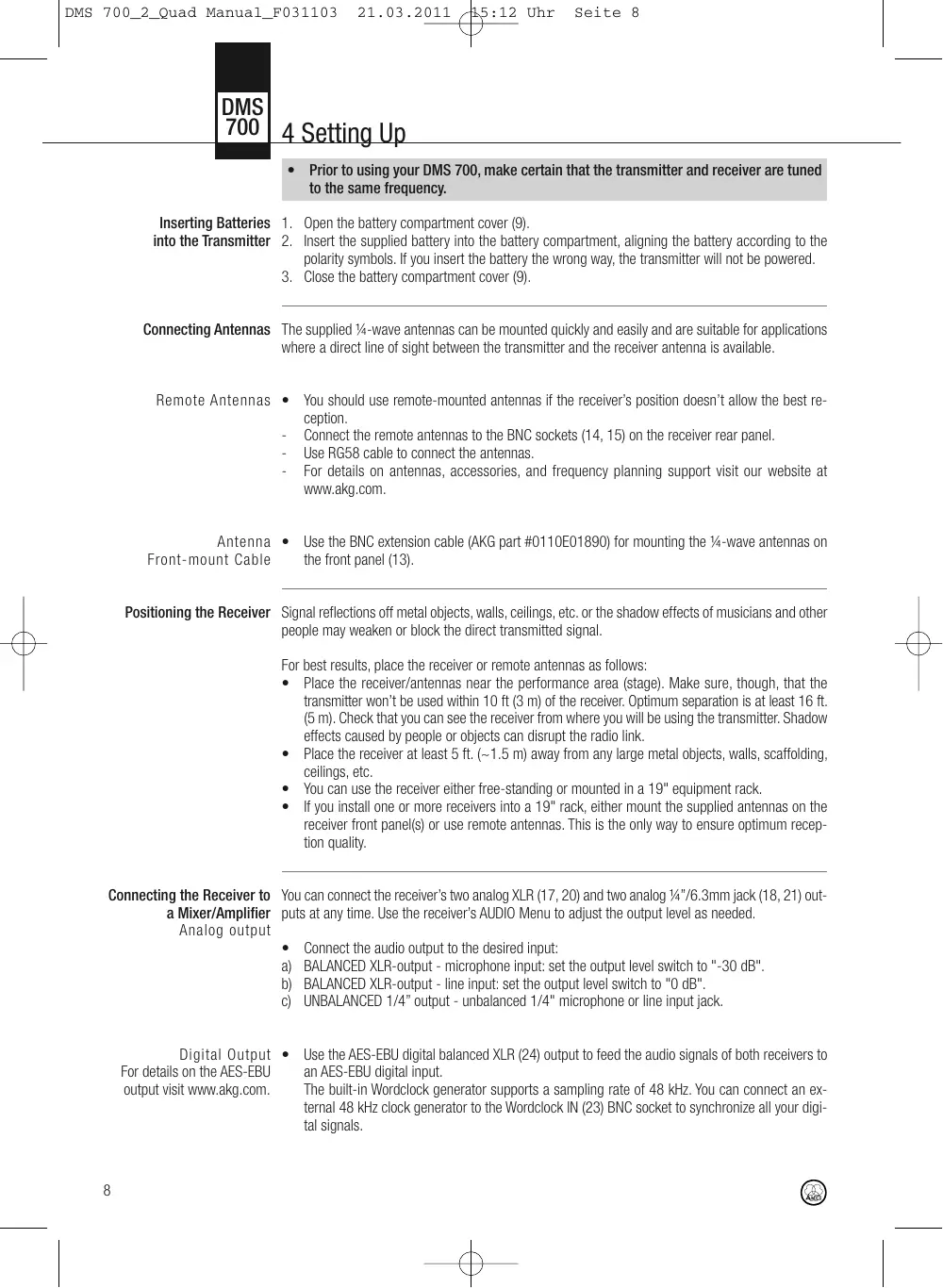 DSR 700 - Wireless Microphone System AKG - Free user manual and instructions