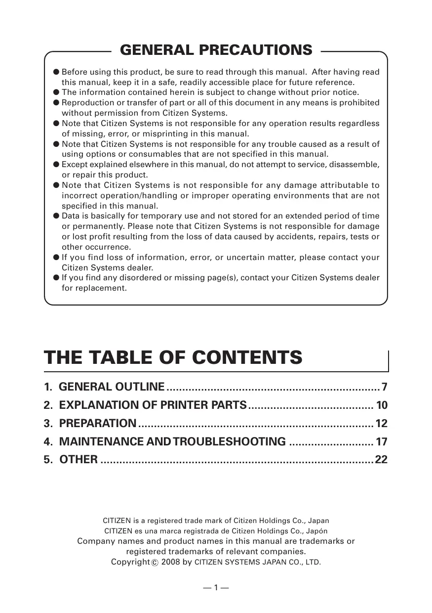 EMC : EN55022 EN61000-3-2 EN61000-3-3 EN55024 Class A This declaration is applied only for 230V model. IMPORTANT: This equipment generates, uses, and can radiate radio frequency energy and if not installed and used in accordance with the instruction manual, may cause interference to radio communications. It has been tested and found to comply with the limits for a Class A computing device pursuant to Subpart J of Part 15 of FCC Rules, which are designed to provide reasonable protection against such interference when operated in a commercial environment. Operation of this equipment in a residential area is likely to cause interference, in which case the user at his own expense will be required to take whatever measures may be necessary to correct the interference. CAUTION: Use shielded cable for this equipment. GENERAL PRECAUTIONS ● Before using this product, be sure to read through this manual. After having read this manual, keep it in a safe, readily accessible place for future reference. ● The information contained herein is subject to change without prior notice. ● Reproduction or transfer of part or all of this document in any means is prohibited without permission from Citizen Systems. ● Note that Citizen Systems is not responsible for any operation results regardless of missing, error, or misprinting in this manual. ● Note that Citizen Systems is not responsible for any trouble caused as a result of using options or consumables that are not specified in this manual. ● Except explained elsewhere in this manual, do not attempt to service, disassemble, or repair this product. ● Note that Citizen Systems is not responsible for any damage attributable to incorrect operation/handling or improper operating environments that are not specified in this manual. ● Data is basically for temporary use and not stored for an extended period of time or permanently. Please note that Citizen Systems is not responsible for damage or lost profit resulting from the loss of data caused by accidents, repairs, tests or other occurrence. ● If you find loss of information, error, or uncertain matter, please contact your Citizen Systems dealer. ● If you find any disordered or missing page(s), contact your Citizen Systems dealer for replacement. Company names and product names in this manual are trademarks or registered trademarks of relevant companies. Copyright c 2008 by CITIZEN SYSTEMS JAPAN CO., LTD. —1— SAFETY PRECAUTIONS ... WHICH SHOULD BE STRICTLY OBSERVED Before using this product for the first time, carefully read these SAFETY PRECAUTIONS. Improper handling may result in accidents (fire, electric shock or injury). In order to prevent injury to operators, third parties, or damage to property, special warning symbols are used in the User’s Manual to indicate important items to be strictly observed. ● After having read this Manual, keep it in a safe, readily accessible place for future reference. ● Some of the descriptions contained in this manual may not be relevant to some printer models. The following describes the degree of hazard and damage that could occur if the printer is improperly operated by ignoring the instructions indicated by the warning symbols. WARNING Neglecting precautions indicated by this symbol may result in fatal or serious injury. CAUTION Neglecting precautions indicated by this symbol may result in injury or damage to properties. This symbol is used to alert your attention to important items. This symbol is used to alert you to the danger of electric shock or electrostatic damage. This symbol denotes a request to unplug the printer from the wall outlet. This symbol is used to indicate useful information, such as procedures, instructions or the like. This symbol is used to indicate prohibited actions. —2— WARNING ■ Do not use or store this product in a place where it will be exposed to: