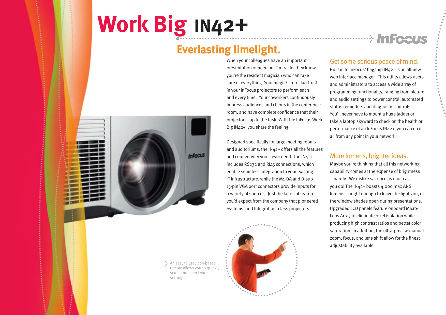 IN42+ When your colleagues have an important presentation or need an IT miracle, they know you’re the resident magician who can take care of everything. Your magic? lron-clad trust in your InFocus projectors to perform each and every time. Your coworkers continuously impress audiences and clients in the conference room, and have complete confidence that their projector is up to the task. With the InFocus Work Big IN42+, you share the feeling. Designed specifically for large meeting rooms and auditoriums, the IN42+ offers all the features and connectivity you’ll ever need. The IN42+ includes RS232 and RJ45 connections, which enable seamless integration to your existing ITinfrastructure, while the M1-DA and D-sub 15-pin VGA port connectors provide inputs for a variety of sources. Just the kinds of features you’d expect from the company that pioneered Systems- and Integration- class projectors. Built in to InFocus flagship IN42+ is an all-new web interface manager. This utility allows users and administrators to access a wide array of programming functionality, ranging from picture and audio settings to power control, automated status reminders and diagnostic controls. You’ll never have to mount a huge ladder or take a laptop skyward to check on the health or performance of an InFocus IN42+, you can doit all from any point in your network! Maybe you're thinking that all this networking capability comes at the expense of brightness — hardly. We dislike sacrifice as much as you do! The IN42+ boasts 4,000 max ANSI lumens—bright enough to leave the lights on, or the window shades open during presentations. Upgraded LCD panels feature onboard Micro- Lens Array to eliminate pixel isolation while producing high contrast ratios and better color saturation. In addition, the ultra-precise manual zoom, focus, and lens shift allow forthe finest adjustability available.