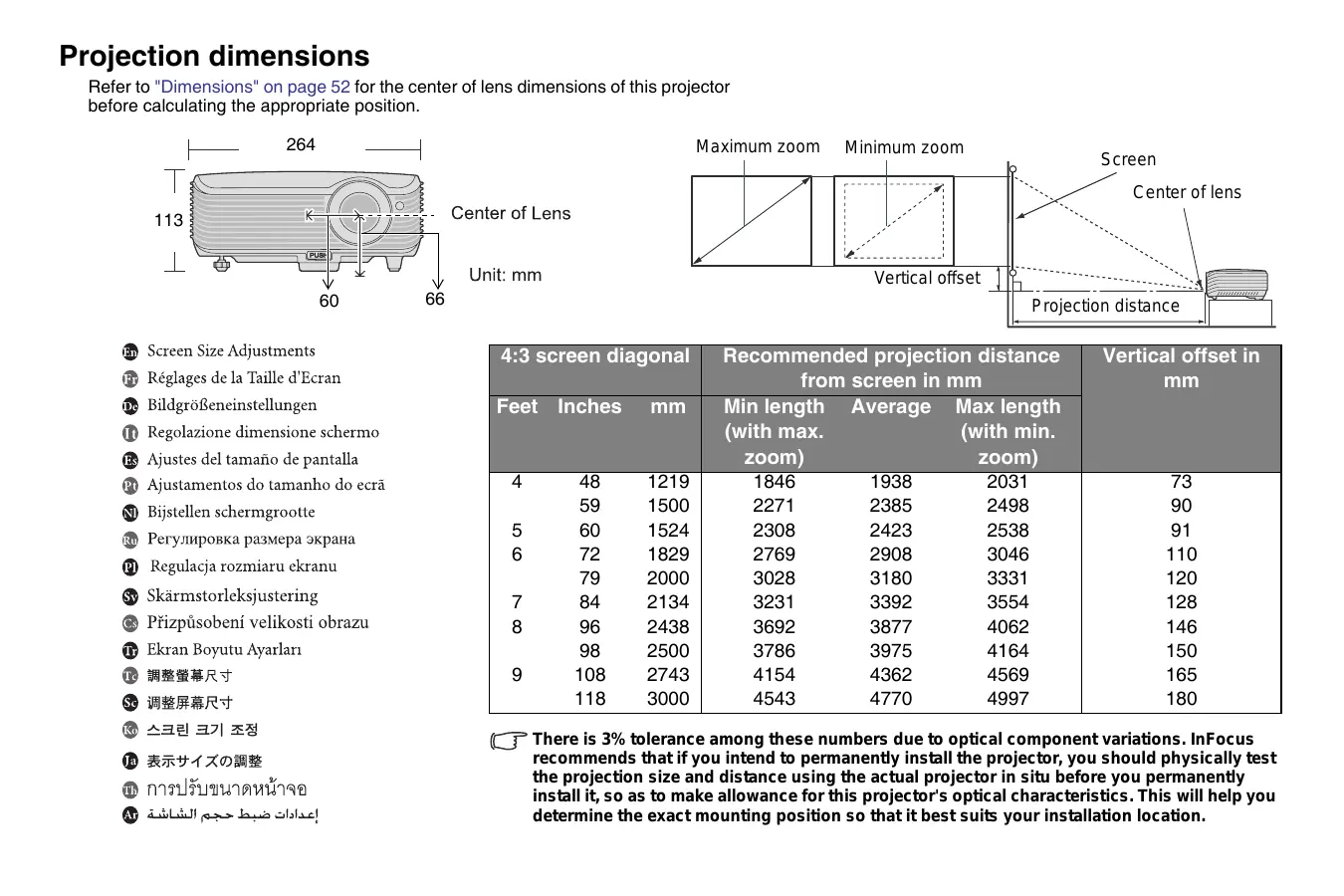 Unit: mm (ei 60 66 Projection distance @ Screen Size Adjustments 4:3 screen diagonal Recommended projection distance Vertical offset in @ Réglages de la Taille d'Ecran from screen in mm @ Bildgrôfeneinstellungen Feet Inches mm Minlength Average Max length ® Regolazione dimensione schermo (with max. (with min. @ Ajustes del tamaño de pantalla @ Ajustamentos do tamanho do ecrä © Bijstellen schermgrootte ® Peryamposka pasmepa 9Kpana @ Regulacja rozmiaru ekranu ® Skärmstorleksjustering @ Prizpüsobeni velikosti obrazu @ Ekran Boyutu Ayarlan ® HERERS S BERERT © sa 271 z# (CF There is 3% tolerance among these numbers due to optical component variations. InFocus D xrY17x0o8# recommends that if you intend to permanentiy install the projector, you should physically test + u the projection size and distance using the actual projector in situ before you permanently © niiuanannne install it, so as to make allowance for this projector's optical characteristics. This will help you @ lil en dus Slolacf determine the exact mounting position so that it best suits your installation location.