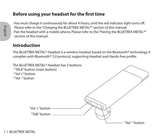 The BLUETREK METAL® headset is a wireless headset based on the Bluetooth® technology. It complies with Bluetooth® 2.0 protocol, supporting Headset and Hands-free profile.