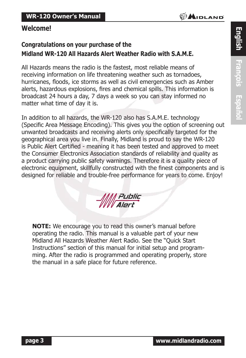 (Specific Area Message Encoding). This gives you the option of screening out unwanted broadcasts and receiving alerts only specifically targeted for the geographical area you live in. Finally, Midland is proud to say the WR-120 is Public Alert Certified - meaning it has been tested and approved to meet the Consumer Electronics Association standards of reliability and quality as a product carrying public safety warnings. Therefore it is a quality piece of electronic equipment, skillfully constructed with the finest components and is designed for reliable and trouble-free performance for years to come. Enjoy!