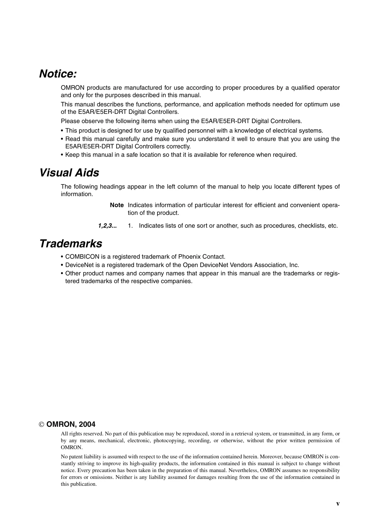 Notice: OMRON products are manufaciured for use according to proper procedures by a qualified operator and only for the purposes described in this manual. This manual describes the functions, performance, and application methods needed for optimum use of the E5AR/E5ER-DRT Digital Controllers. Please observe the following items when using the ESAR/E5ER-DRT Digital Controllers. + This product is designed for use by qualified personnel with a knowledge of electrical systems. + Read this manual carefully and make sure you understand it well to ensure that you are using the ESAR/E5ER-DRT Digital Controllers correctly. + Keep this manual in a safe location so that it is available for reference when required. Visual Aids The following headings appear in the left column of the manual to help you locate different types of information. Note Indicates information of particular interest for efficient and convenient opera- tion of the product. 1,2,3.. 1. Indicates lists of one sort or another, such as procedures, checklists, etc. Trademarks + COMBICON is a registered trademark of Phoenix Contact. + DeviceNet is a registered trademark of the Open DeviceNet Vendors Association, Inc. + Other product names and company names that appear in this manual are the trademarks or regis- tered trademarks of the respective companies. © OMRON, 2004 All rights reserved. No part of this publication may be reproduced, stored in a retrieval system, or transmitted, in any form, or by any means, mechanical, electronic, photocopying, recording, or otherwise, without the prior written permission of OMRON. No patent liability is assumed with respect to the use of the information contained herein. Moreover, because OMRON is con- Stantly striving to improve its high-quality products, the information contained in this manual is subject to change without notice. Every precaution has been taken in the preparation of this manual. Nevertheless, OMRON assumes no responsibility for errors or omissions. Neither is any liability assumed for damages resulting from the use of the information contained in this publication.