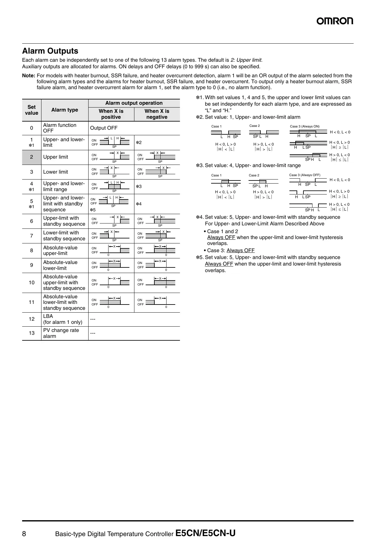 OMRON Alarm Outputs Each alarm can be independently set to one of the following 13 alarm types. The default is 2: Upper limit. Auxiliary outputs are allocated for alarms. ON delays and OFF delays (0 to 999 s) can also be specified. Note: For models with heater burnout, SSR failure, and heater overcurrent detection, alarm 1 will be an OR output of the alarm selected from the following alarm types and the alarms for heater burnout, SSR failure, and heater overcurrent. To output only a heater burnout alarm, SSR failure alarm, and heater overcurrent alarm for alarm 1, set the alarm type to O (i. Alarm output operation ., no alarm function). #1. With set values 1, 4 and 5, the upper and lower limit values can be set independently for each alarm type, and are expressed as lower-limit Absolute-value