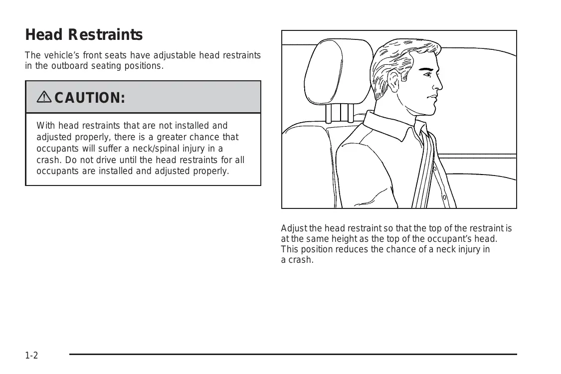 ead Restraints e vehicle's front seats have adjustable head restraints in the outboard seating positions. ACAUTION: With head restraints that are not installed and adjusted properly, there is a greater chance that occupants will suffer a neck/spinal injury in a crash. Do not drive until the head restraints for all occupants are installed and adjusted properly. Adjust the head restraint so thatthe top of the restraint is atthe same height as the top ofthe occupant's head. This position reduces the chance of a neck injury in a crash.