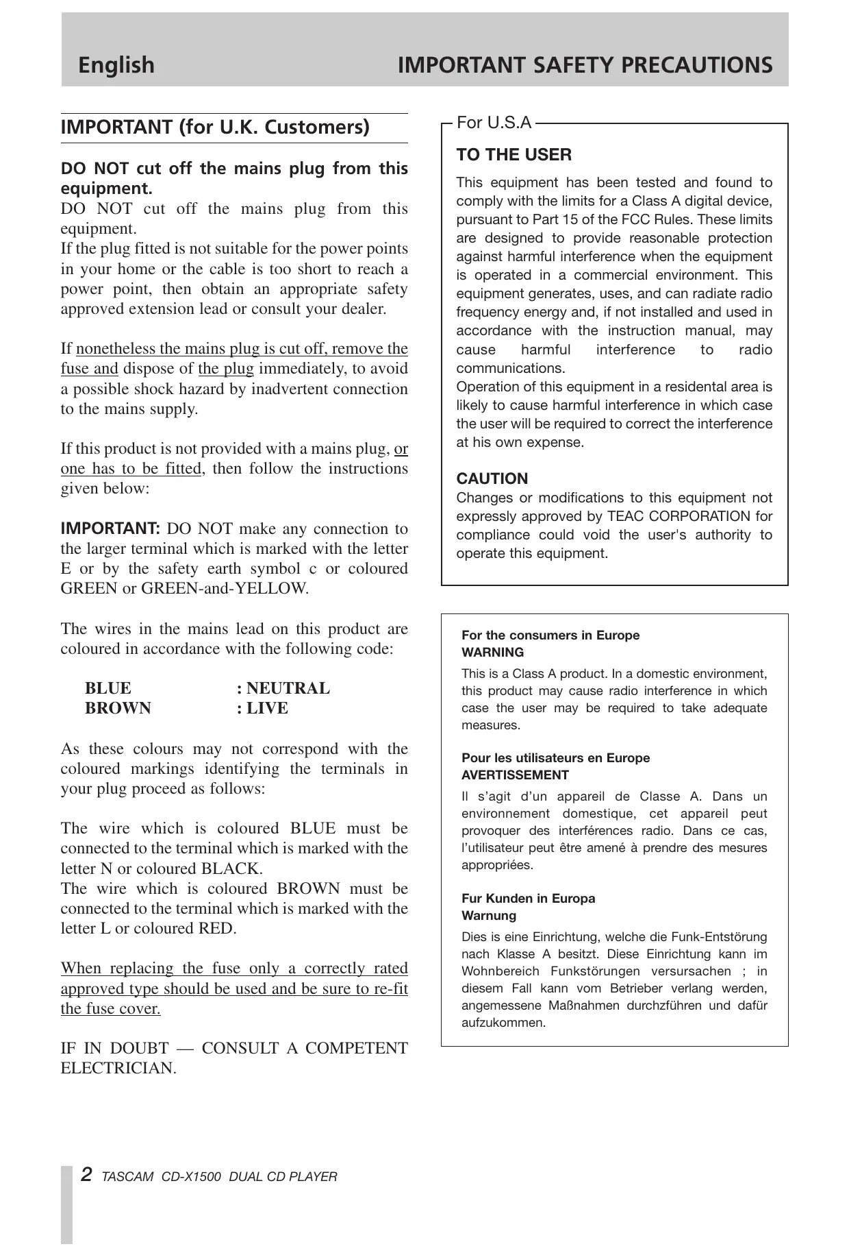 Find the device manual for free CD-X1500 TASCAM in PDF.