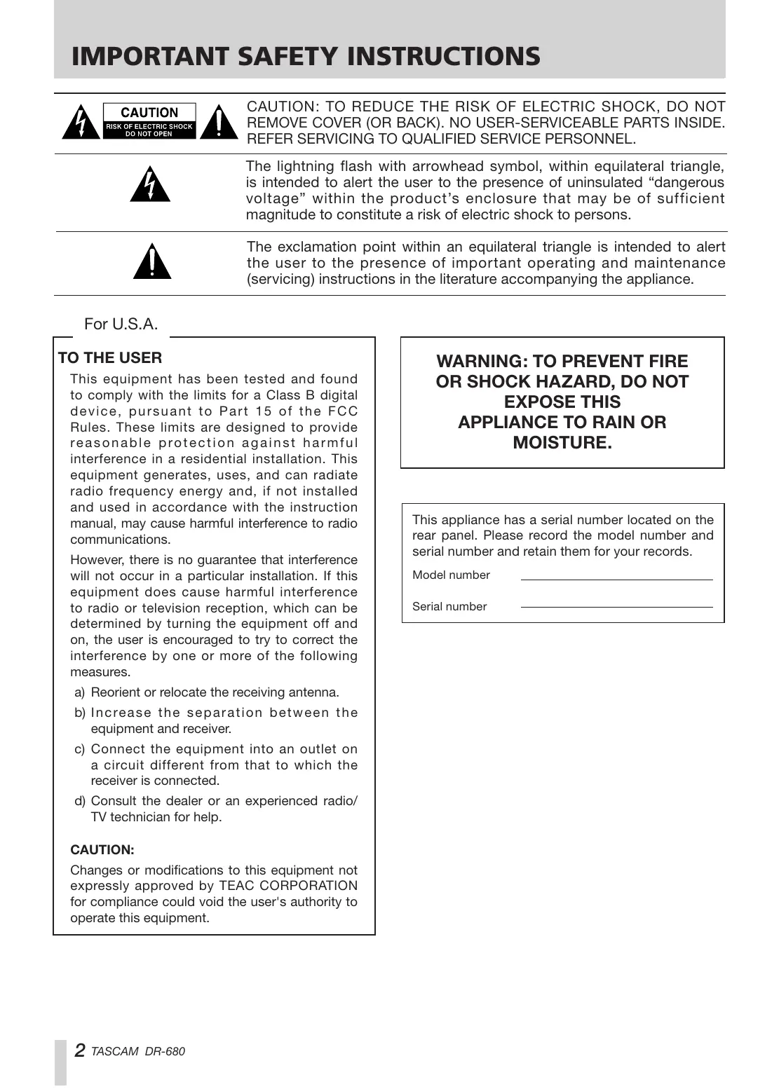 to comply with the limits for a Class B digital : EXPOSE THIS device, pursuant to Part 15 of the FCC Rules. These limits are designed to provide APPLIANCE TO RAIN OR reasonable protection against harmful MOISTURE. interference in a residential installation. This equipment generates, uses, and can radiate radio frequency energy and, if not installed and used in accordance with the instruction manual, may cause harmful interference to radio communications. This appliance has a serial number located on the rear panel. Please record the model number and : serial number and retain them for your records. However, there is no guarantee that interference will not occur in a particular installation. lf this equipment does cause harmful interference to radio or television reception, which can be determined by turning the equipment off and on, the user is encouraged to try to correct the interference by one or more of the following measures. Model number Serial number a) Reorient or relocate the receiving antenna. b) Increase the separation between the equipment and receiver. c) Connect the equipment into an outlet on a circuit different from that to which the receiver is connected. d) Consult the dealer or an experienced radio/ TV technician for help. CAUTION: Changes or modifications to this equipment not expressly approved by TEAC CORPORATION for compliance could void the user's authority to operate this equipment. 2 TASCAM DR-680