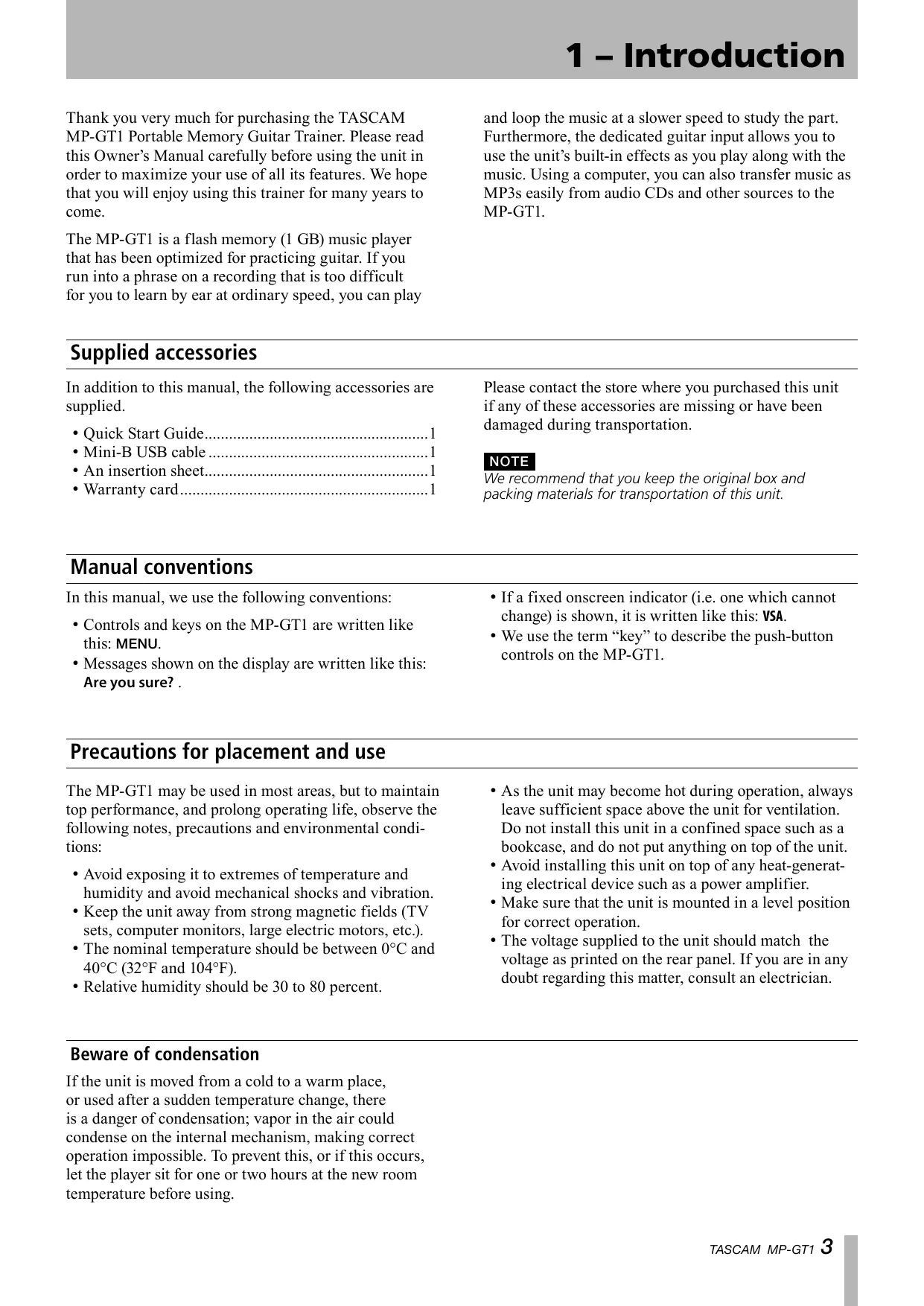 Thank you very much for purchasing the TASCAM MP-GT1 Portable Memory Guitar Trainer. Please read this Owner’s Manual carefully before using the unit in order to maximize your use of all its features. We hope that you will enjoy using this trainer for many years to come.