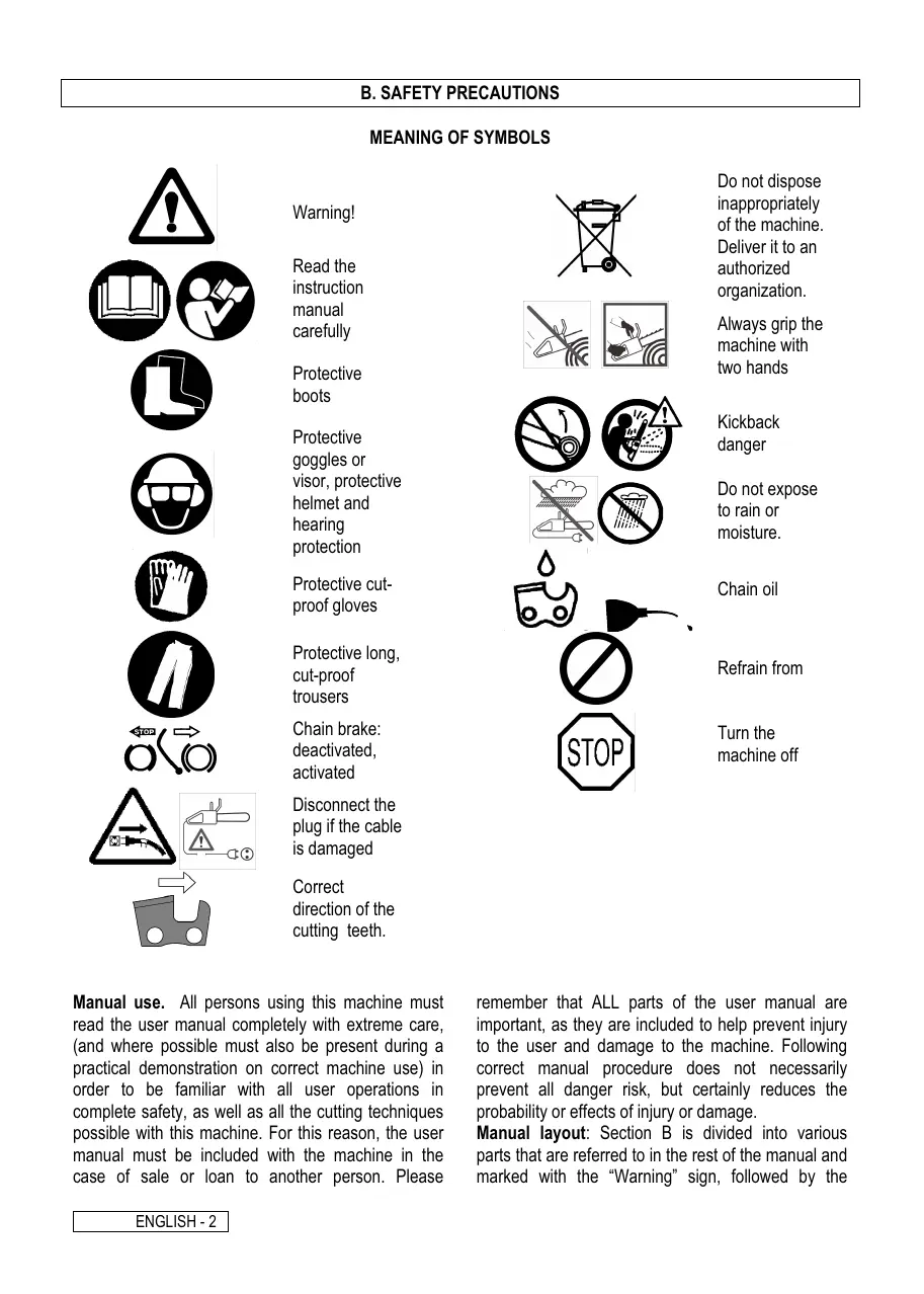 Precautions prior to machine use. Never permit this machine to be used by any persons who are not perfectly familiar with the manual instructions, who are not in good physical and mental condition, who are not sufficiently competent and by children (local regulations may sometimes limit the age of operators permitted to use the machine). Inexperienced persons must follow a training period operating on a saw horse only. The user is responsible for any accidents that may cause injury to other persons and damage to property, as well as any other type of danger risk. The machine must never be used for operations other than those specifically described in this manual, and exclusively with the bars and chains indicated. This machine must never be used when users are tired, or not in good physical condition, or if under the effect of any substance that may alter their physical or mental condition (pharmaceuticals, alcohol, drugs etc.) Make certain that the user knows how to stop the motor and chain in case of necessity. Take great care and pay close attention at all times when using this machine, following all general behaviour rules according to good sense.