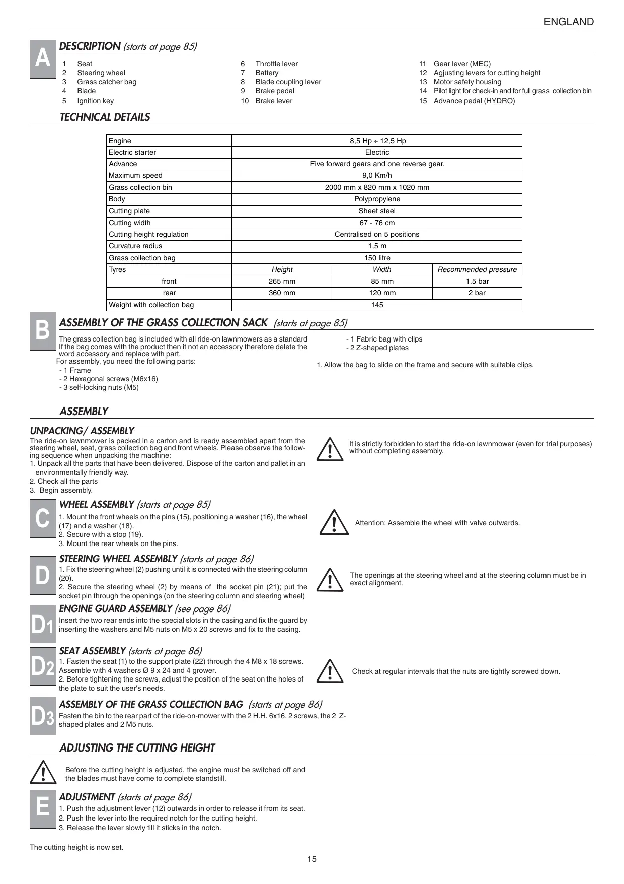 EMPTYING THE GRASS COLLECTION BAG(starts at page 86)