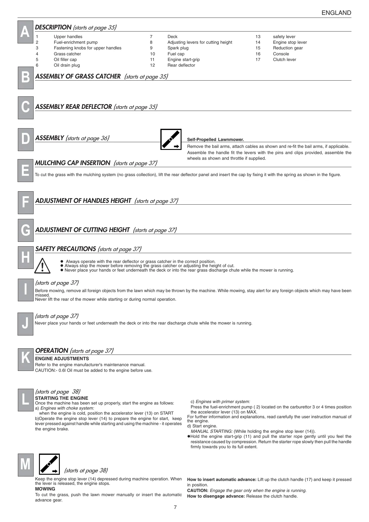 ENGLAND DESCRIPTION {start at page 35) 1 Upper handies 7 Deck 13 safetylever 2 Fuel-enrichment pump 8 Adjusting levers for cutting height 14 Engine stop lever 3 Fastening knobs for upper handies 9 Spark plug 15 Reduction gear 4 Grass catcher 10 Fuel cap 16 Console 5 Oil fller cap 1 Engine start-grip 17 Ciutchlever 6 Oil drain plug 12 Rear deflector ASSEMBLY OF GRASS CATCHER {starts at page 35] ASSEMBLY REAR DEFLECTOR {starts at page 35) ASSEMBLY /starts at page 36] 4 Self-Propelled Lawnmower. PA = | Remove the bail arms, attach cables as shown and re-fi the bail arms, if applicable. Assemble the handle fit the levers with the pins and clips provided, assemble the wheels as shown and throttle if supplied. MULCHING CAP INSERTION {starts at page 37) To cut the grass with the mulching system {no grass collection), lift the rear deflector panel and insert the cap by fixing it with the spring as shown in the figure. ADJUSTMENT OF HANDLES HEIGHT {starts at page 37) ADJUSTMENT OF CUTTING HEIGHT{starts at page 37) SAFETY PRECAUTIONS /starts at page 37) Always operate with the rear deflector or grass catcher in the correct position. Always stop the mower before removing he grass catcher or adjusting the height of cut. ‘ Never place your hands or feet underneath the deck or into the rear grass discharge chute while the mower is running.