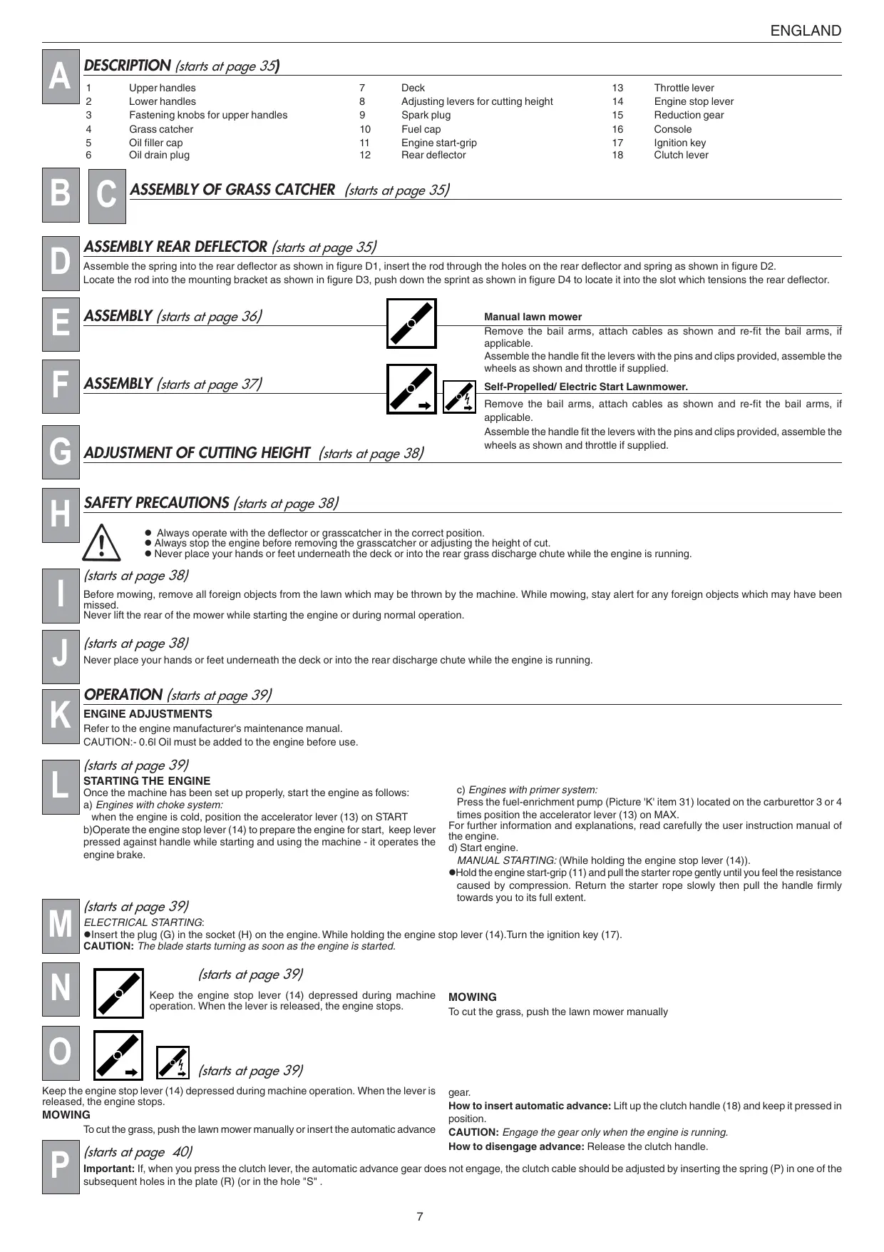 j)Ensure that the grass catcher and deflector are correctly located. failure to do so may result in foreign objects being ejected by the blade.