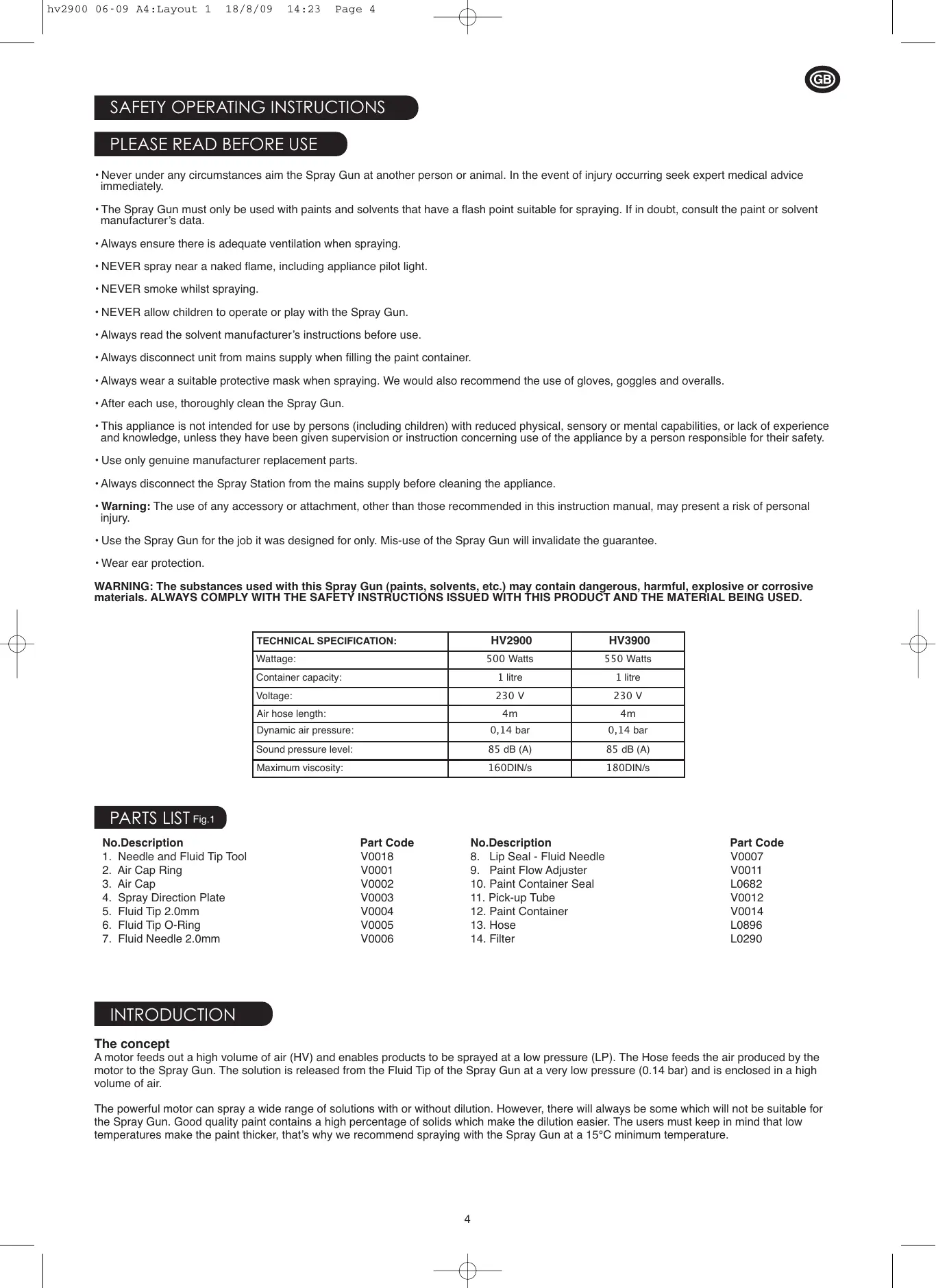 INTROD The concept A motor feeds out a high volume of air (HV) and enables products to be sprayed at a low pressure (LP). The Hose feeds the air produced by the motor to the Spray Gun. The solution is released from the Fluid Tip of the Spray Gun at a very low pressure (0.14 bar) and is enclosed in a high volume of air.