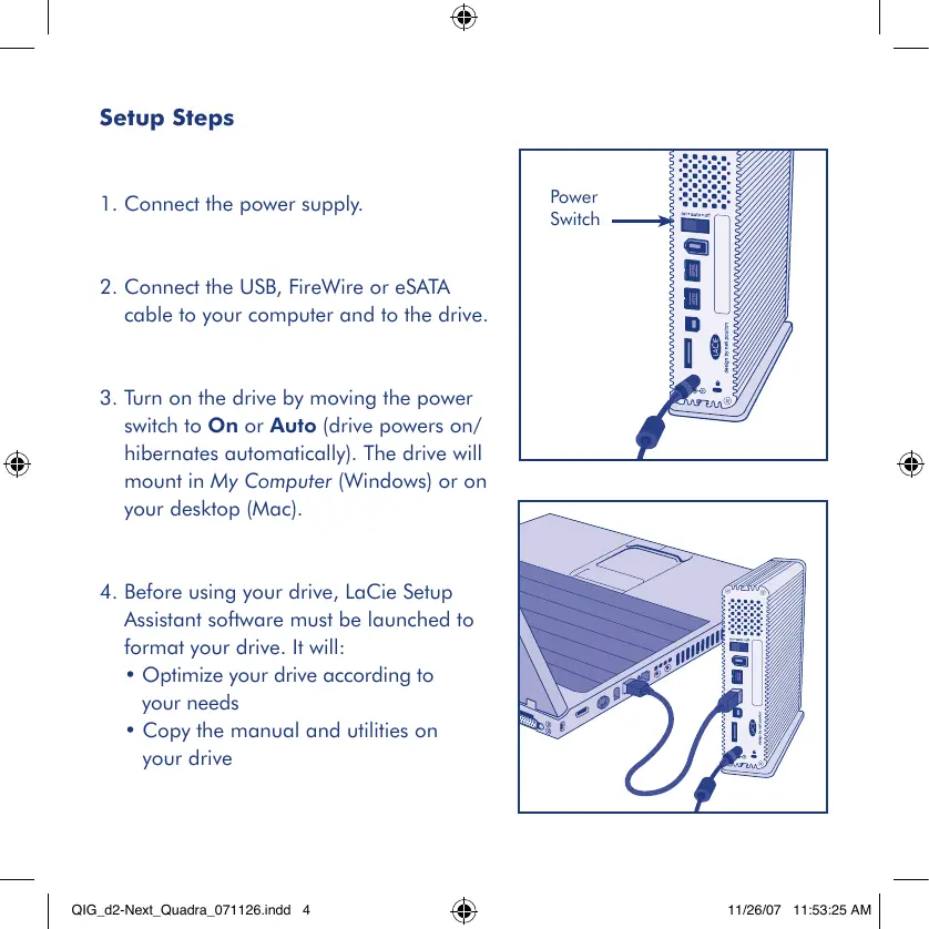 Assistant sofware must be launched to format your drive. It will: + Optimize your drive according to your needs + Copy the manual and utilities on your drive QIG_d2-Next Quadra_071126indd 4 & 11/26/07 11:53:25 AM