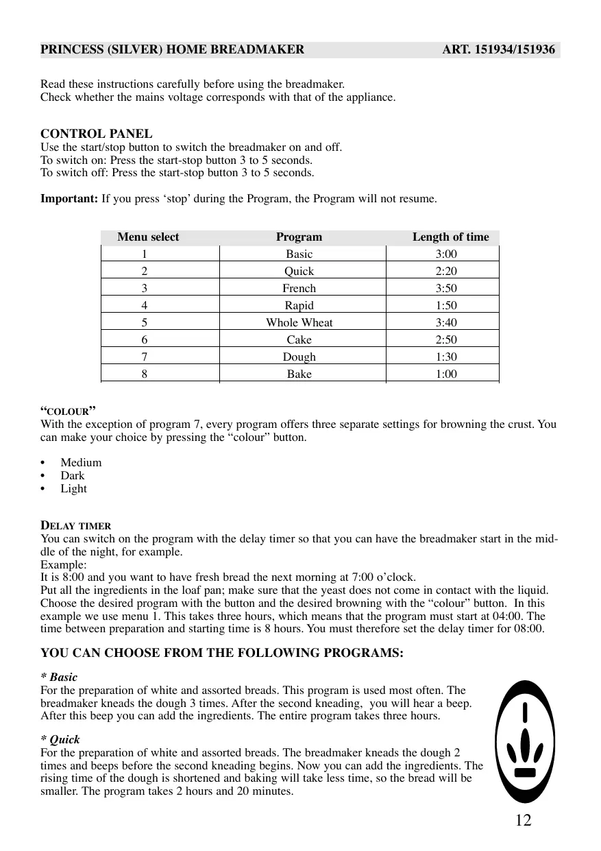Example: It is 8:00 and you want to have fresh bread the next morning at 7:00 o’clock. Put all the ingredients in the loaf pan; make sure that the yeast does not come in contact with the liquid. Choose the desired program with the button and the desired browning with the “colour” button. In this example we use menu 1. This takes three hours, which means that the program must start at 04:00. The time between preparation and starting time is 8 hours. You must therefore set the delay timer for 08:00.